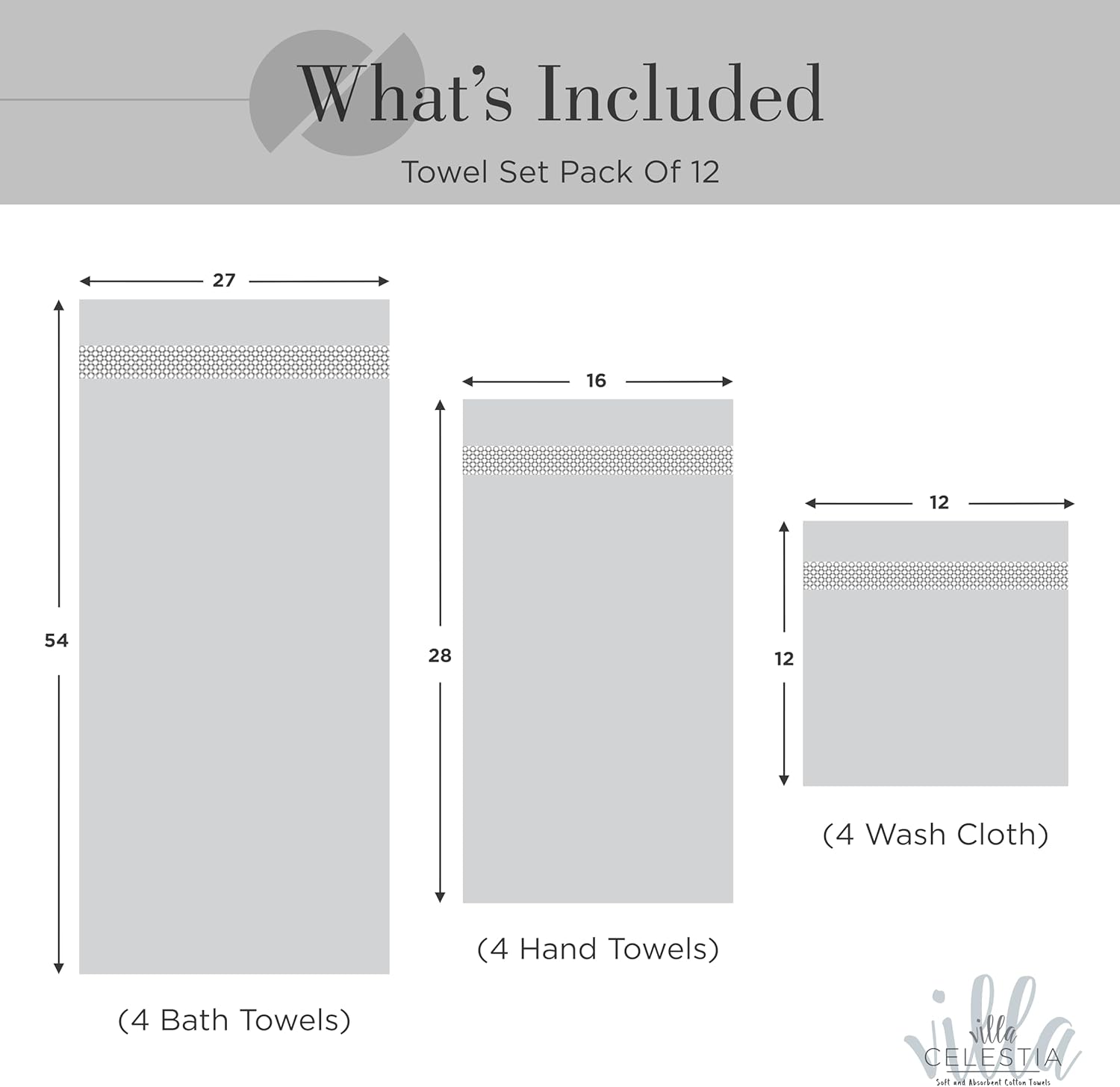 - VILLA CELESTIA LUXURIOUS TOWEL SET (PACK OF 12): Uplift your mood and bathing experience with the super soft and luxurious touch of our Villa Celestia Bath Towels Set. Bundled in a 12 pack design, our towel sets for bathroom consists of 4 Bath Towels (27β X 54β), 4 Hand Towels (16β X 28β), and 4 Washcloths (12β X 12β), giving you the complete package of comfort, indulgence, and delight.