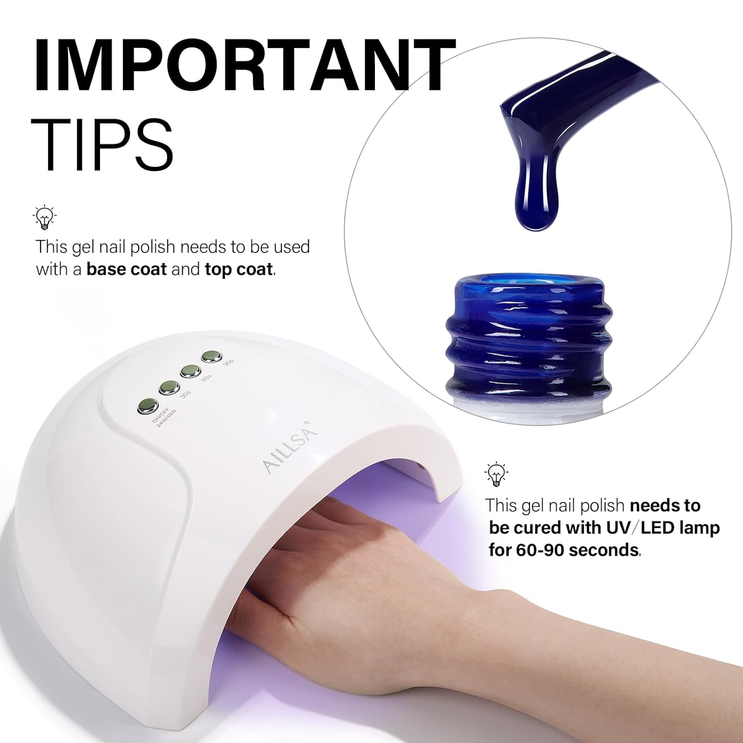 - ă LONG-LASTING SHINE ăAILLSA Christmas blue gel nail polish needs to be cured under L E D/U V light, under the correct use steps, it can last for 21-28 days and keep the shiny luster. You'll never have to worry about your nails peeling off while showering and doing housework. Let AILLSA serve you a longer time!