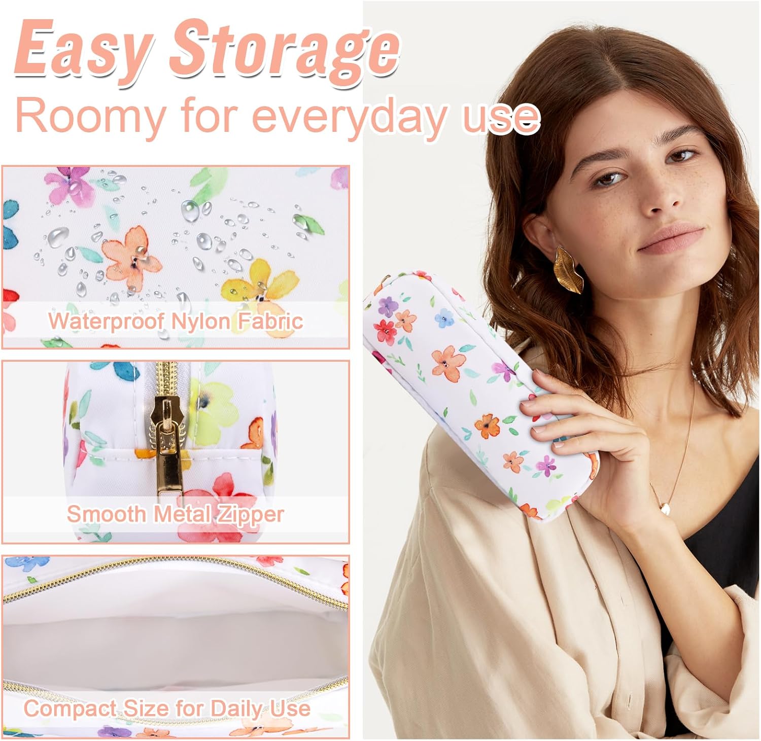 - ❤【Multiple Sizes & Colors】Large, Small, Mini, or Slim, we have it all! Cosmetic bags are available in many colors: Blue-Daisy, Green-Daisy, White-Flower, Pink-Flower and other colors for you to choose. Nylon makeup bag for purse can be used for travel, outdoors and organization, it can be used as a purse bag, travel pouch, clutch, makeup organizer and more.