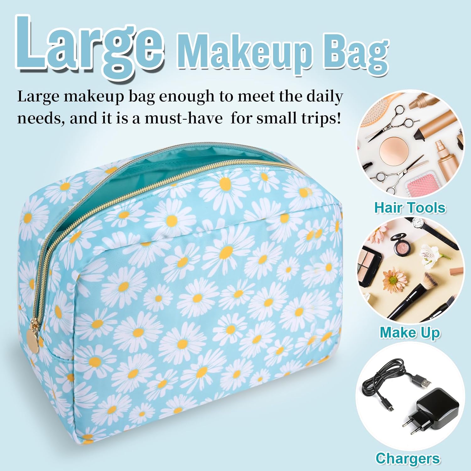 Nylon Large Floral Makeup Organizer Bag, Preppy Big Cute Flower Cosmetic Zipper Pouch Multi-compartment with Dividers, Waterproof Toiletry Make Up Brushes Bag Travel Essentials for Women(Blue-Daisy)