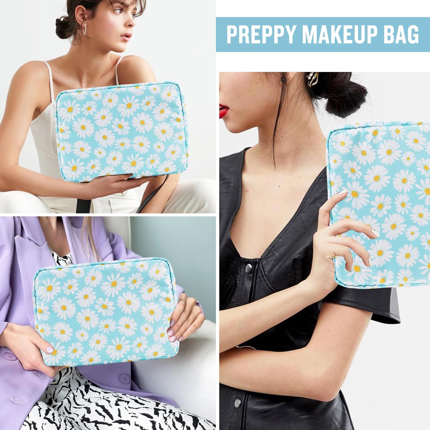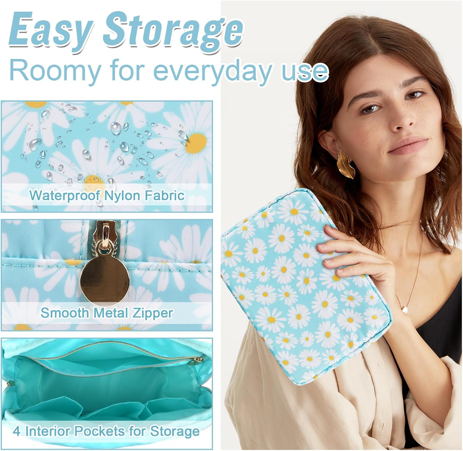 - ❤【Multiple Sizes & Colors】Large, Small, Mini, or Slim, we have it all! Cosmetic bags are available in many colors: Blue-Daisy, Green-Daisy, White-Flower, Pink-Flower and other colors for you to choose. Nylon makeup bag for purse can be used for travel, outdoors and organization, it can be used as a purse bag, travel pouch, clutch, makeup organizer and more.