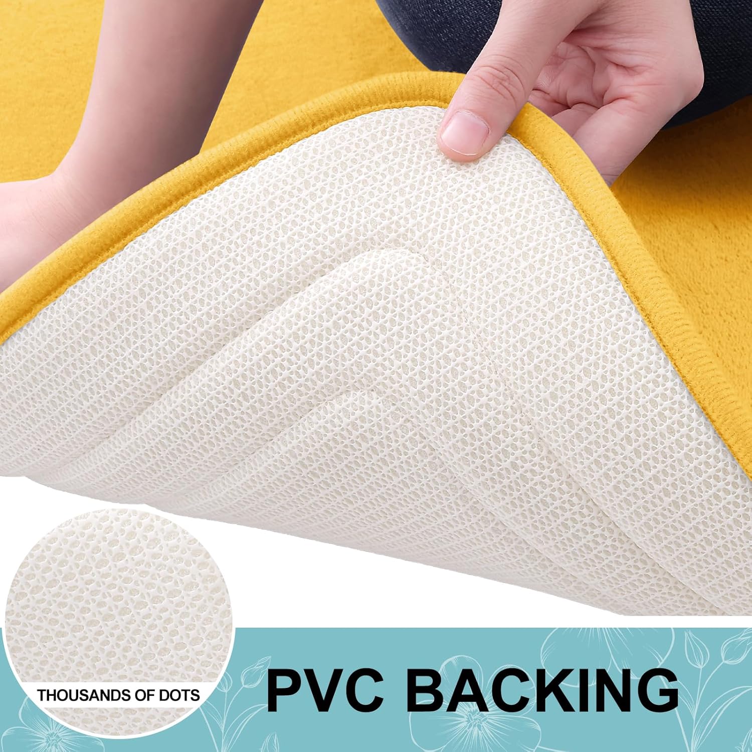 - [STABLE FOOTING] Our bathroom mat is equipped with a robust and enduring PVC backing, preventing shifting and skidding. Unlike mats with rubber backing that may wear off after washing, our bath mat ensures lasting durability. For a secure footing, keep the floor beneath the rug dry and avoid placing it on wet surfaces.