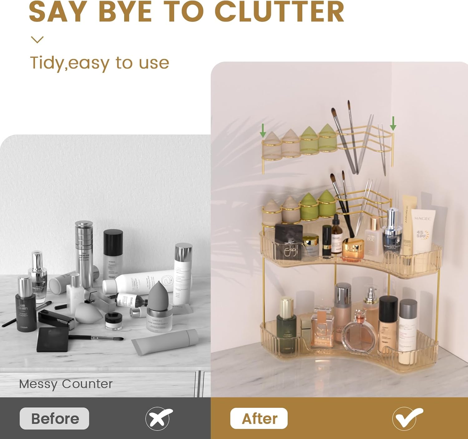 - ăCorner Makeup OrganizerăSay goodbye to your cluttered countertop, our countertop organizer fully utilizes corner space, adding 100% extra storage space and keeping a tidy and organized bathroom counter