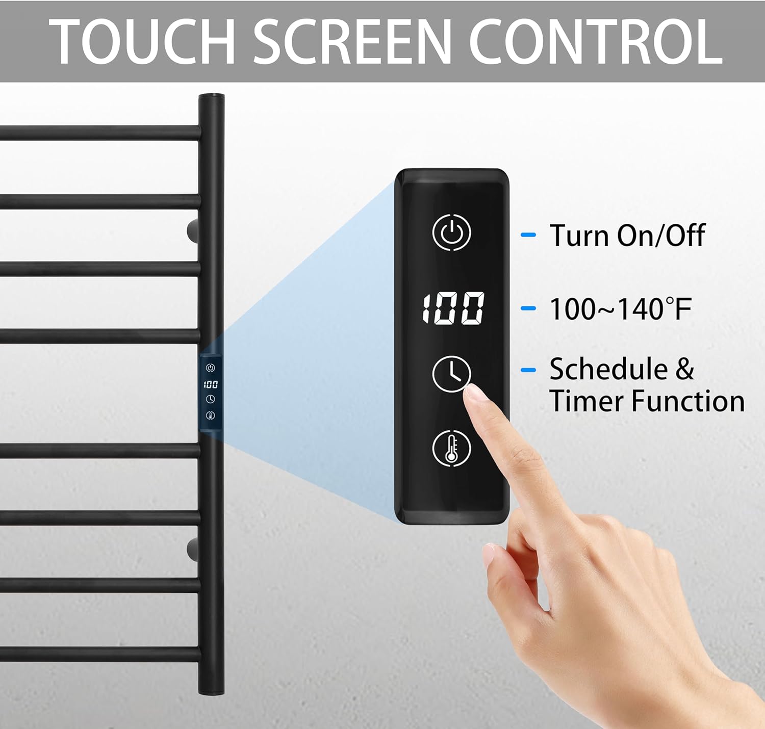 - [TOUGH SCREEN CONTROL]: Manually to turn on/off anytime. Countdown Timer function from 1 hour to 8 hours. Temperature control from 100°F to 140°F.