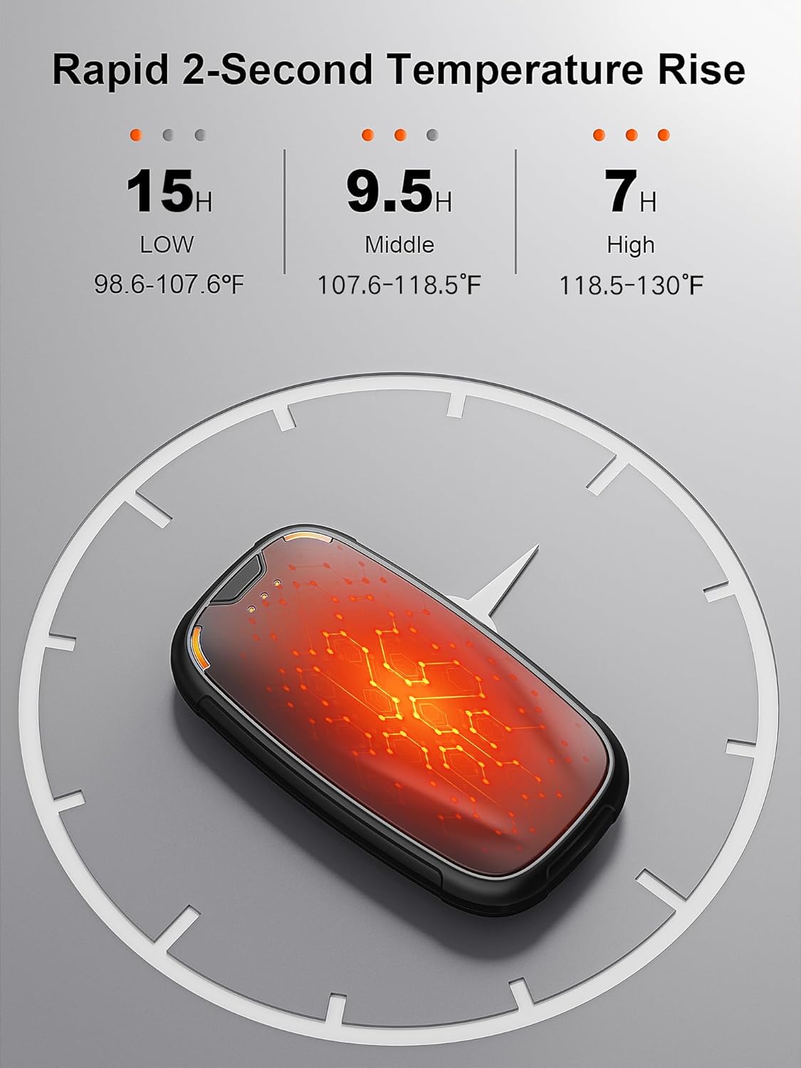 - 【Three Seconds Quick Heat】There is an on button on the top of the electric hand warmers rechargeable, press and hold for three seconds and the reusable hand warmer will turn on the heating to 105.8℉-114.8℉-125.6℉. Adjust the suitable temperature according to different temperature needs.