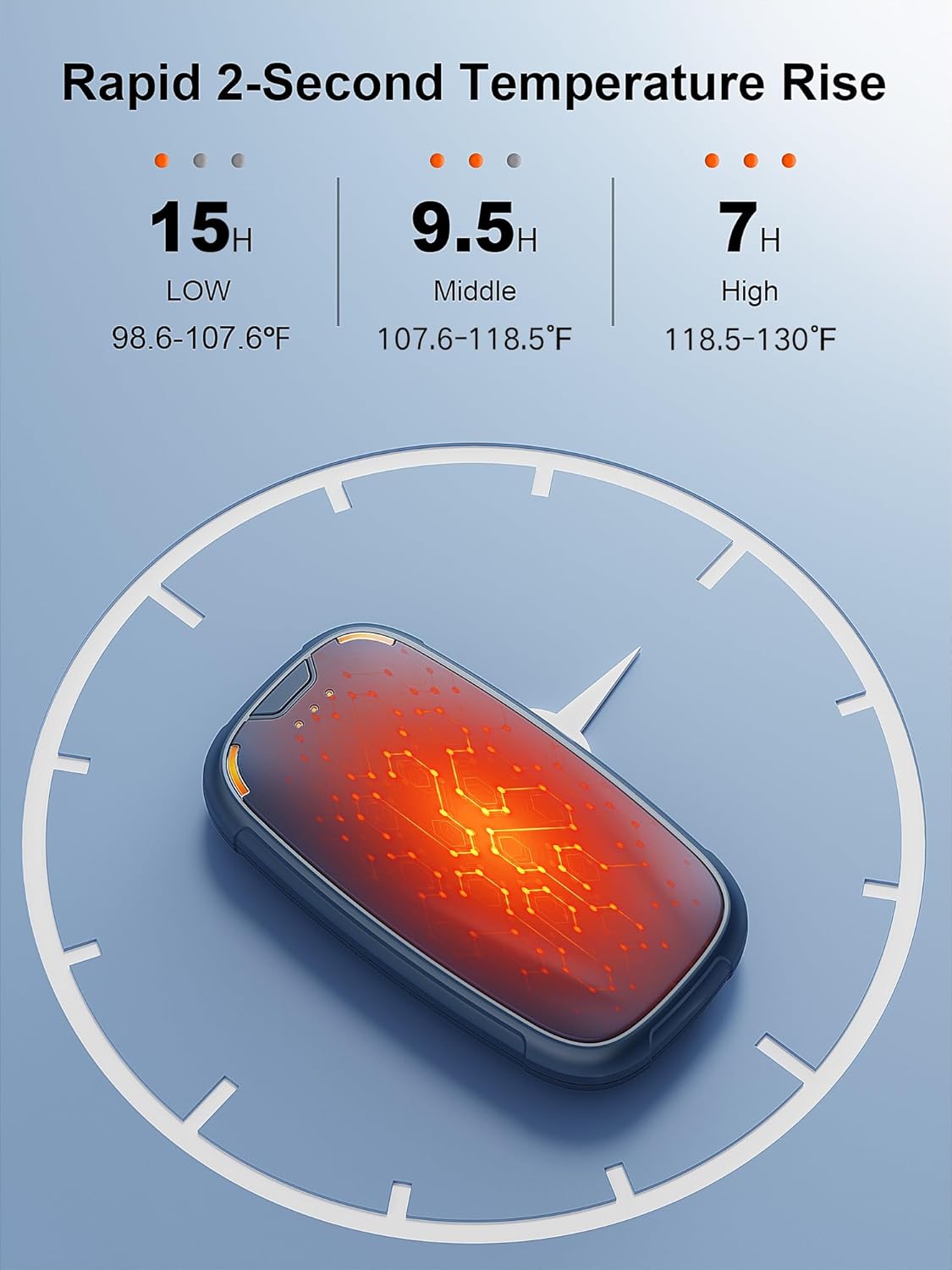 - 【Three Seconds Quick Heat】There is an on button on the top of the electric hand warmers rechargeable, press and hold for three seconds and the reusable hand warmer will turn on the heating to 105.8℉-114.8℉-125.6℉. Adjust the suitable temperature according to different temperature needs.