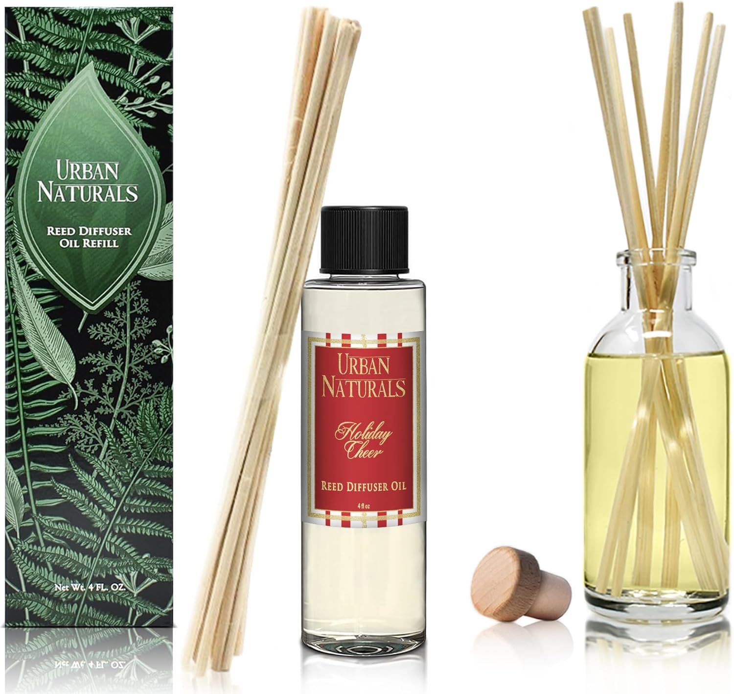 Urban Naturals Reed Diffuser Oil Refill, Holiday Cheer Diffuser Oil with Cranberry, Cinnamon, Evergreen, 4 oz + Free Reed Sticks, Made in The USA