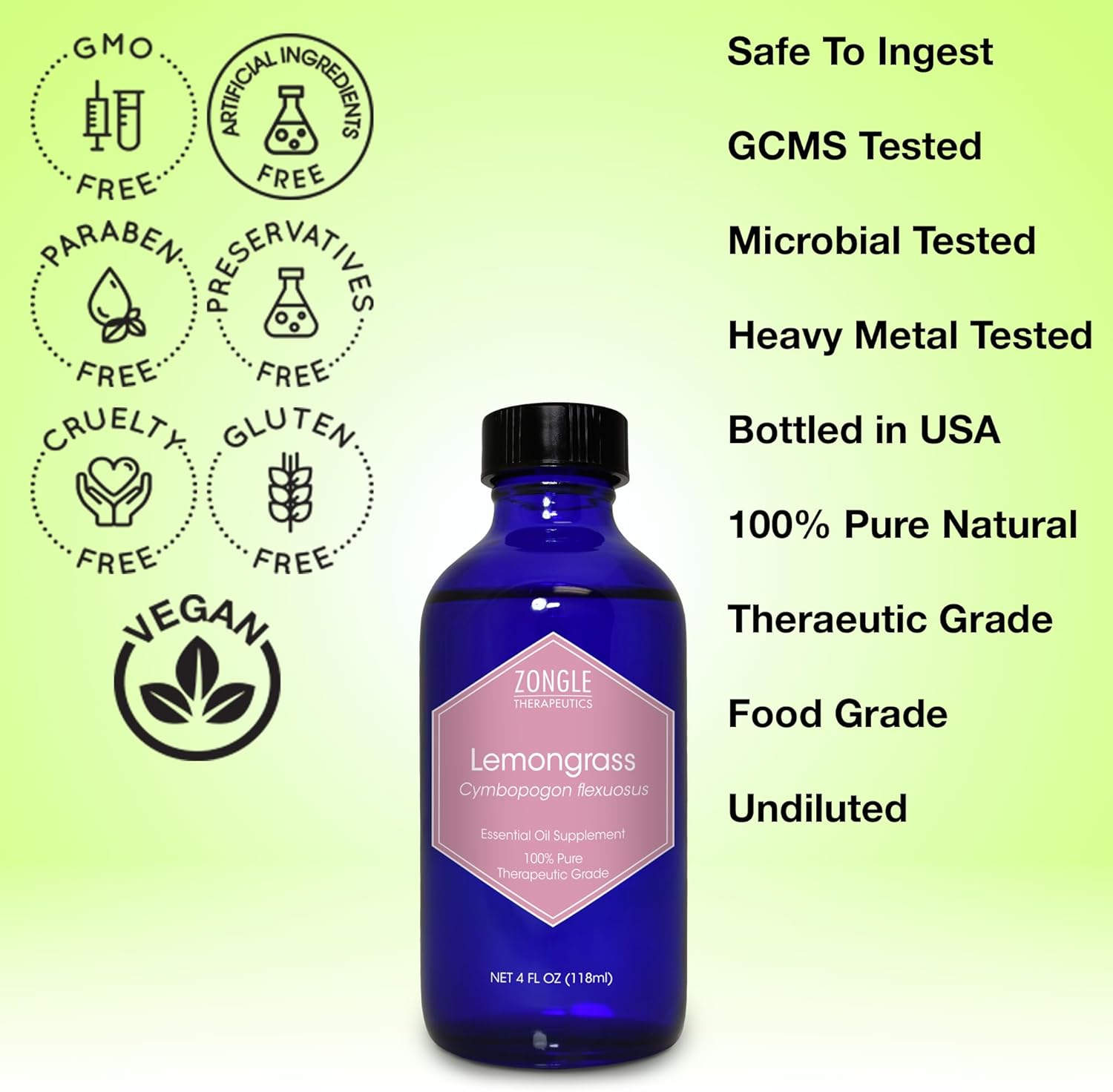Lemongrass Essential Oil, Food Grade, Edible – 100% Pure, Lemongrass Oil,by Zongle Therapeutics, 4 OZ