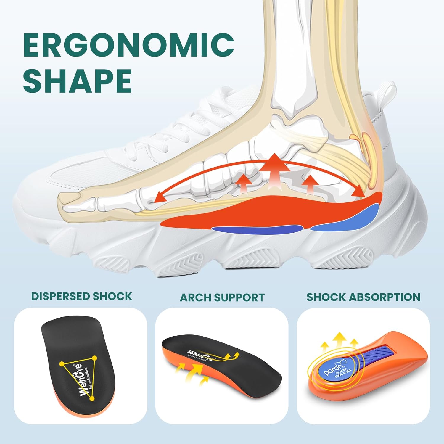 - EXCELLENT CUSHIONING AND SUPPORT - The Welnove heel cups are designed with high-quality gel and foam materials that offer excellent support and cushioning. This combination effectively helps absorb shock and reduce foot fatigue, making it an ideal choice for those who engage in high-impact activities or work on their feet for long hours.