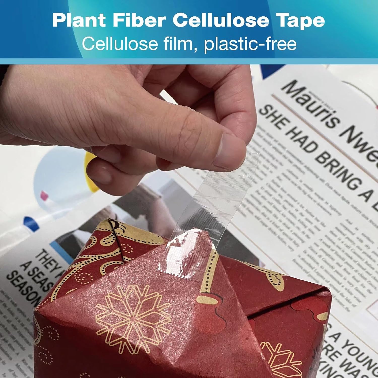 - ♻️A True Magic: This plant-based tapea nddispenser, complete with a plastic-free desktop tape dispenser, works like magic to repair rips and tears seamlessly, perfect for gift wrapping on holidays and birthdays. This clear tape for dispenser also photo-safe and writable.
