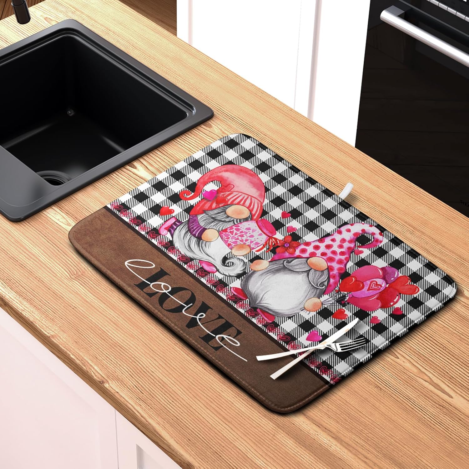 Valentine's Day Dish Drying Mats for Kitchen Counter, Gnome Love Kitchen Drying Mat, Buffalo Plaid Dish Drainer Mat Absorbent Quick Dry Dishes Pad 18 x 24 In - Farmhouse Decor Valentines Gift