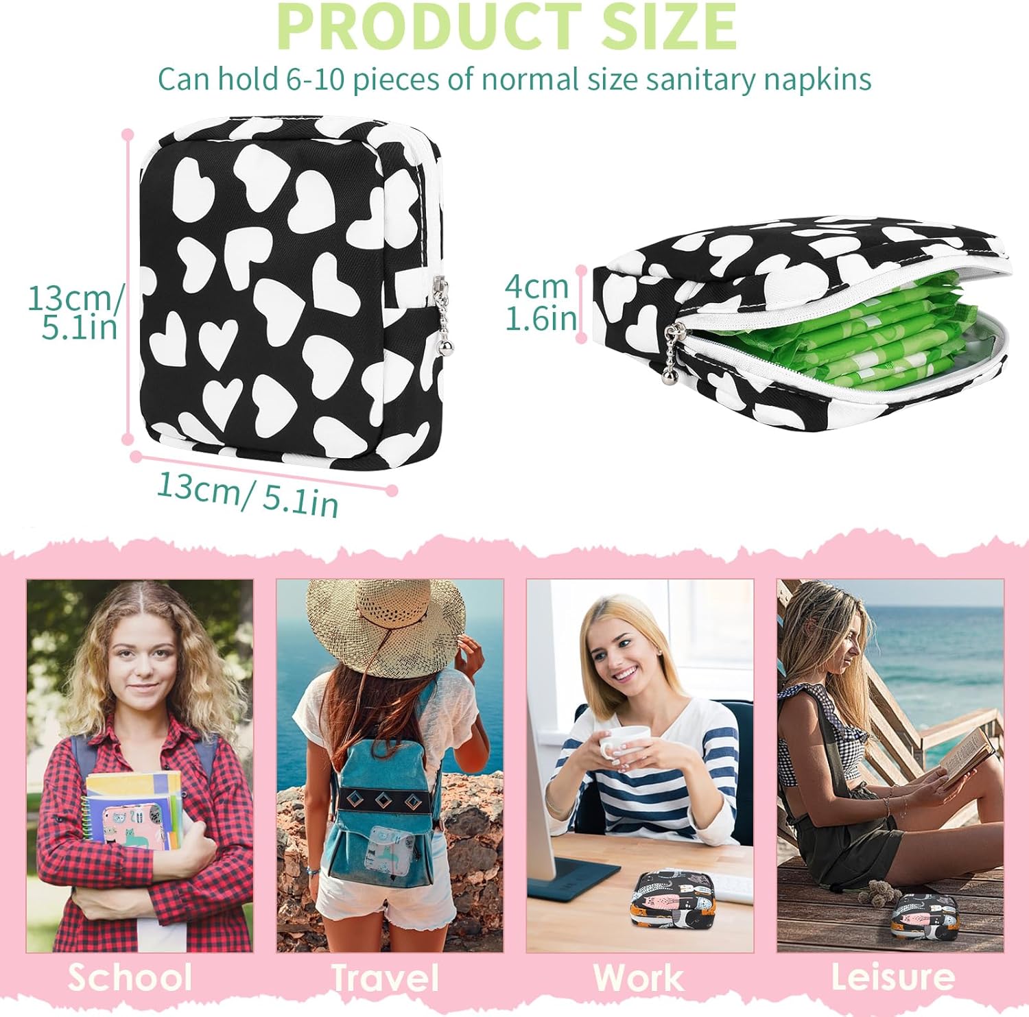 - đ ăMeet Your Day's Needsă- Having a compact size: 5.1 x 5.1 x 1.6 inches, the pad storage bag can hold 6-10 pieces of normal size sanitary napkins. The inner pocket inside the pad pouch is easy to store small size tampons to keep them clean and orderly. Easily put the sanitary pads pouch in your backpack or handbag.