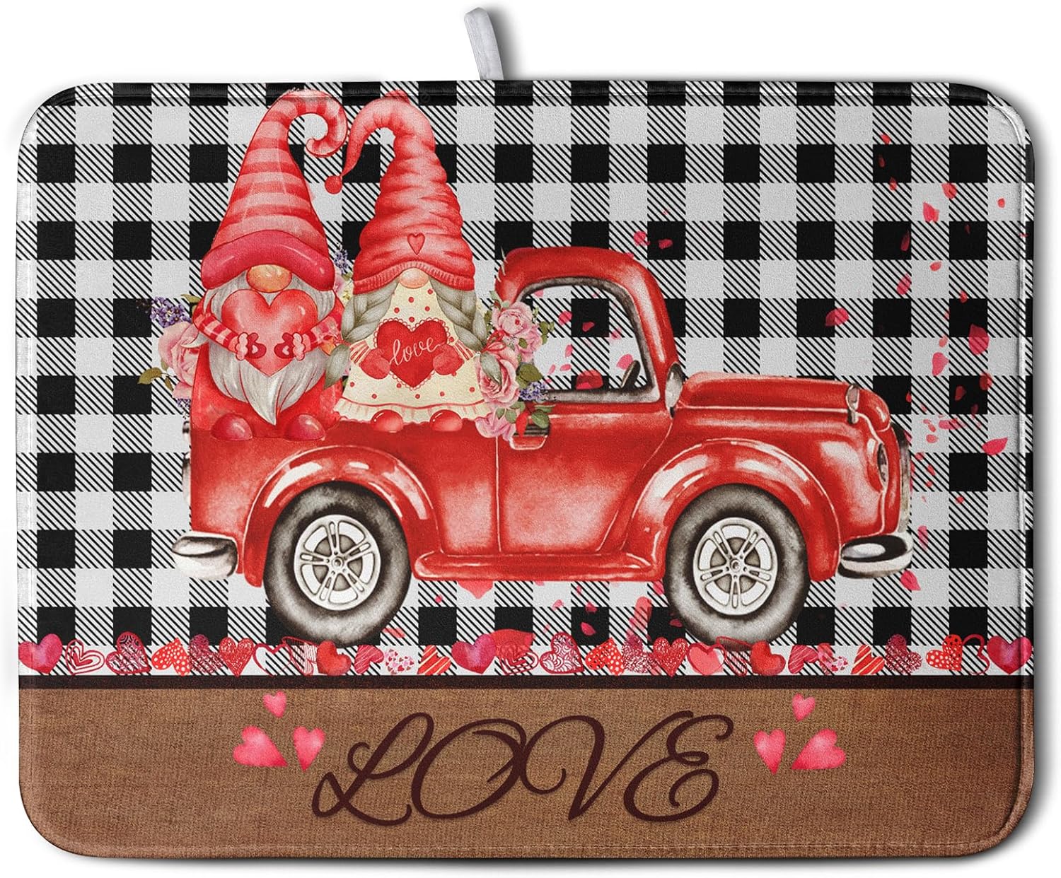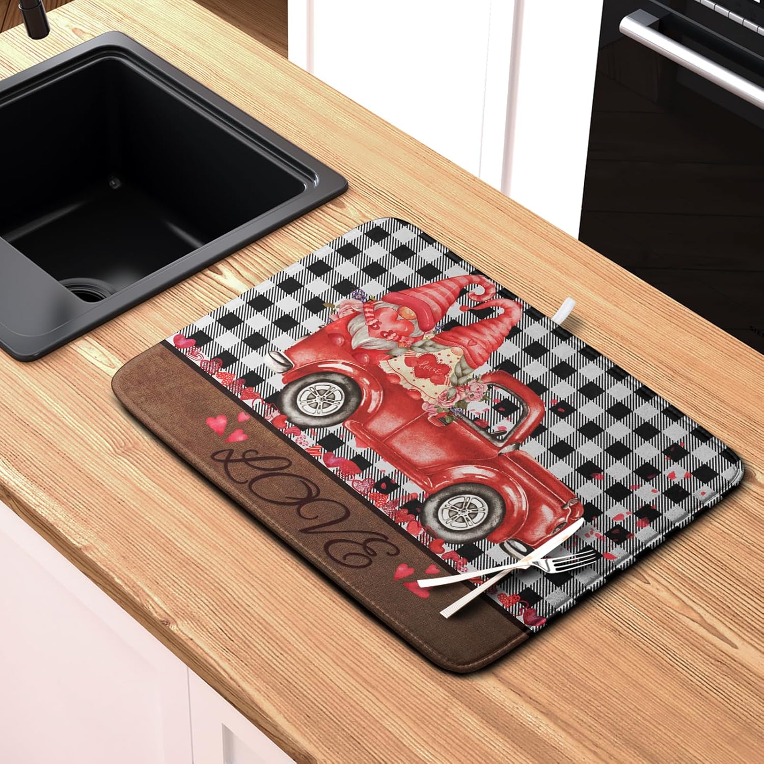 Valentine's Day Dish Drying Mats for Kitchen Counter, Buffalo Plaid Truck Kitchen Drying Mat, Love Heart Gnome Absorbent Dishes Pad 18 x 24 Inch - Farmhouse Decor Valentines Gift