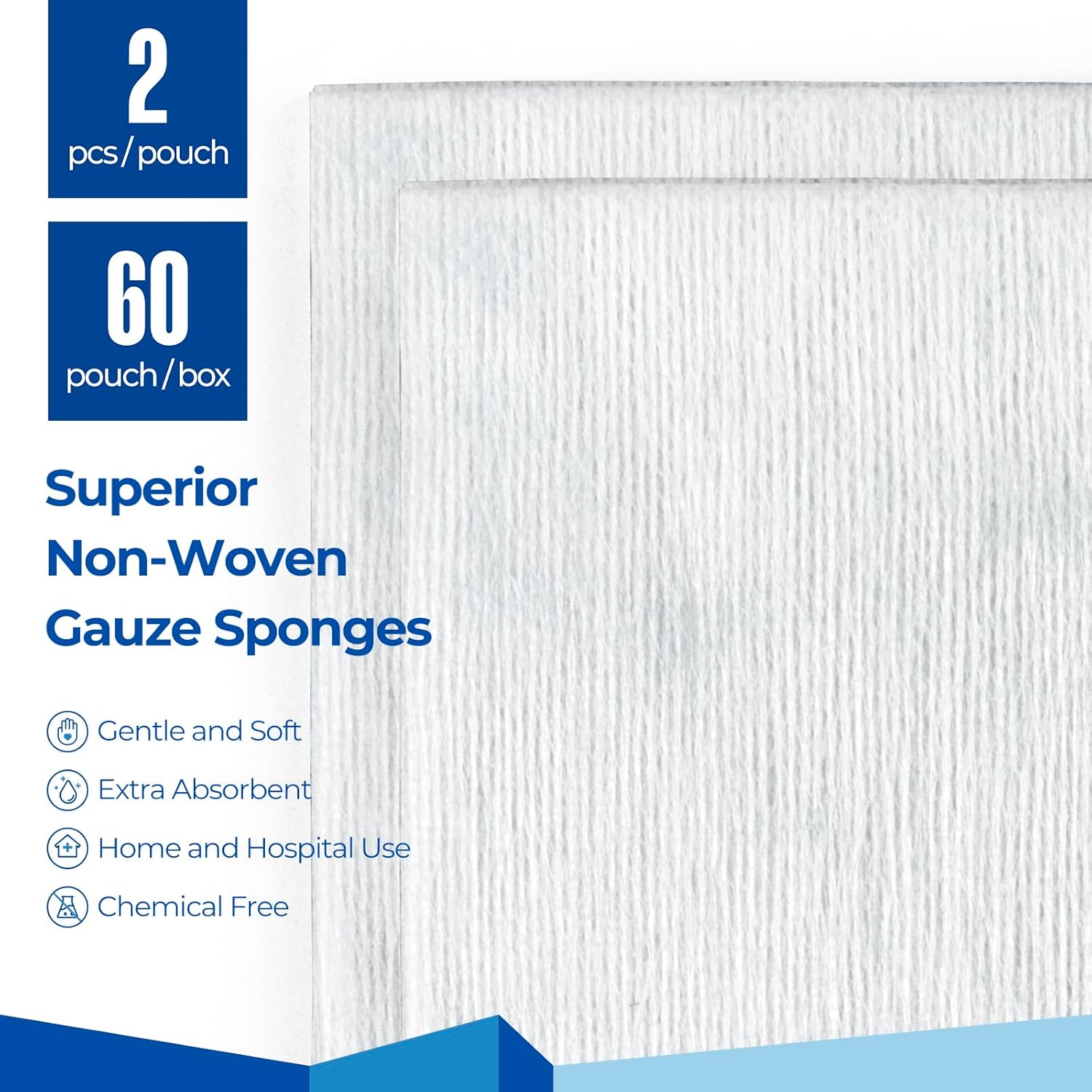 - Sterile Packaging: Each box contains 60 pouches of 120 sterile Nonwoven gauze sponges. Each piece of swabs is well made and has no exposed raw edges, less lint than normal gauze, helpful to avoid further irritation caused by wrapping bandages
