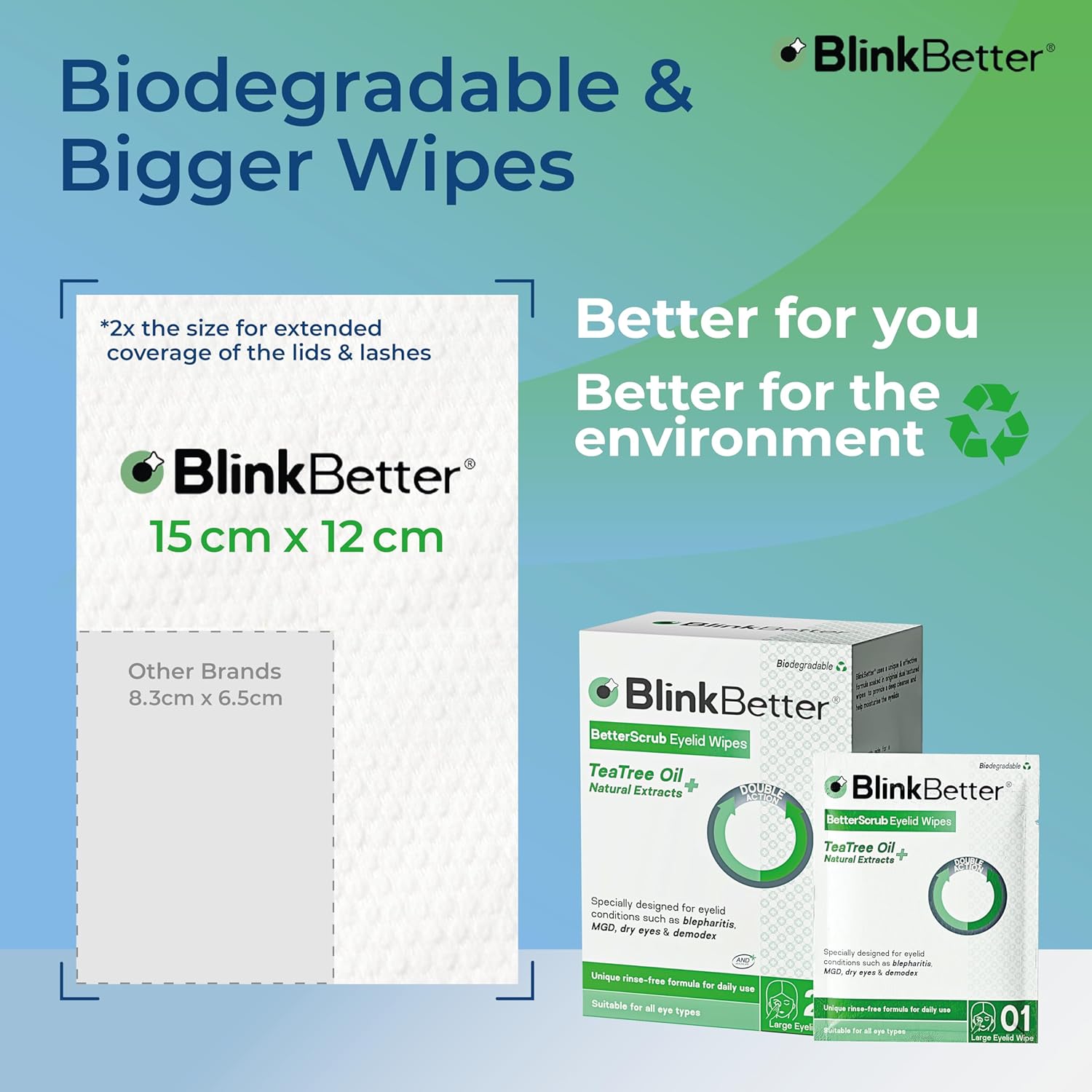 - INSTANT RELIEF: Find immediate relief from discomfort and common eye conditions, such as blepharitis and dry eyes, with our BlinkBetter Eyelid Wipes. Powered by natural ingredients like tea tree oil, chamomile, and aloe vera.