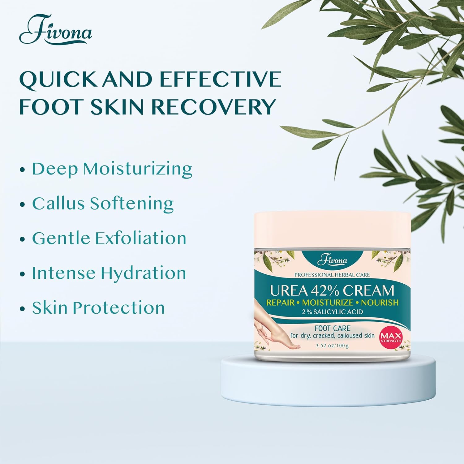 - Nourish and Soften Your Feet - Experience the ultimate relief for rough, cracked skin with our specially formulated 42% Urea Foot Cream enriched with 2% Salicylic Acid, Tea Tree, and Aloe Vera Extract. Fivona Foot Cream deeply moisturizes and hydrates dry skin.