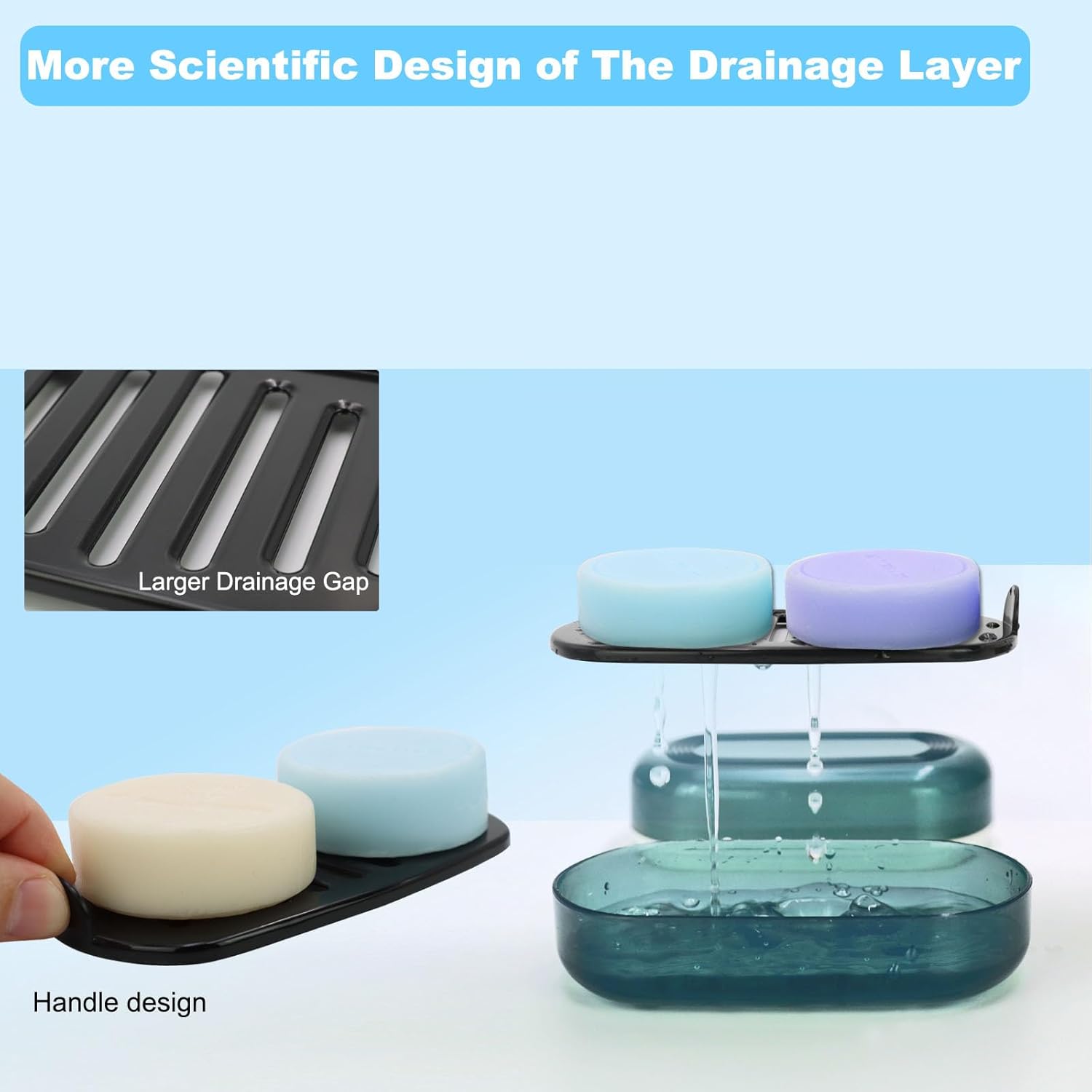 - Quick Draining and Keep Soap Dry: Our bar soap container has a drainage tray with a grid and a convenient handle. It not only drains quickly, but also prevents soap from soaking in excess water. The handle makes it easy to remove the drain tray.