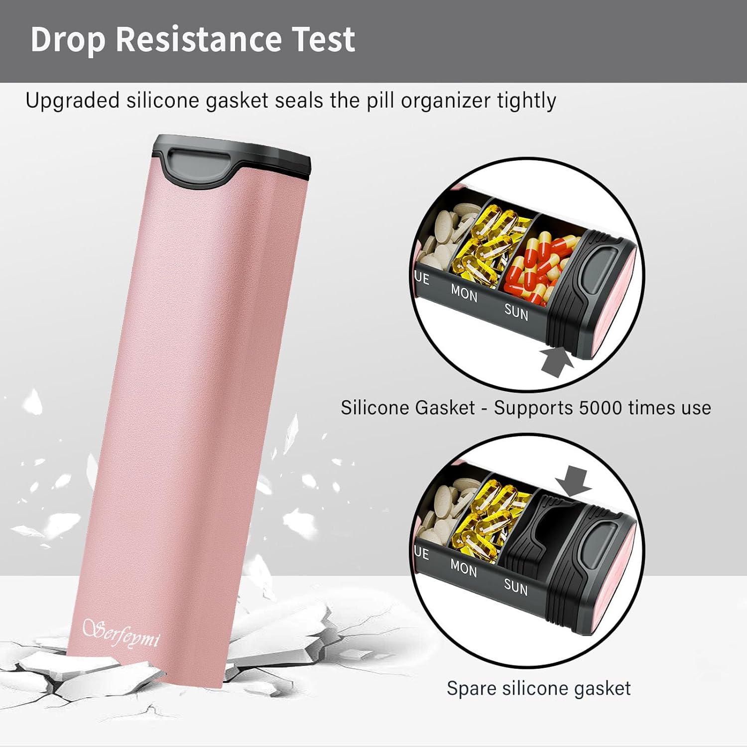 Metal Weekly Pill Organizer, Serfeymi Aluminum Daily Pill Box,7 Day Pill Case Travel Medicine Organizer,Pill Containers(Spare Gasket) for Vitamins, Fish Oils,Pills, Supplement(NO LID)- Pink
