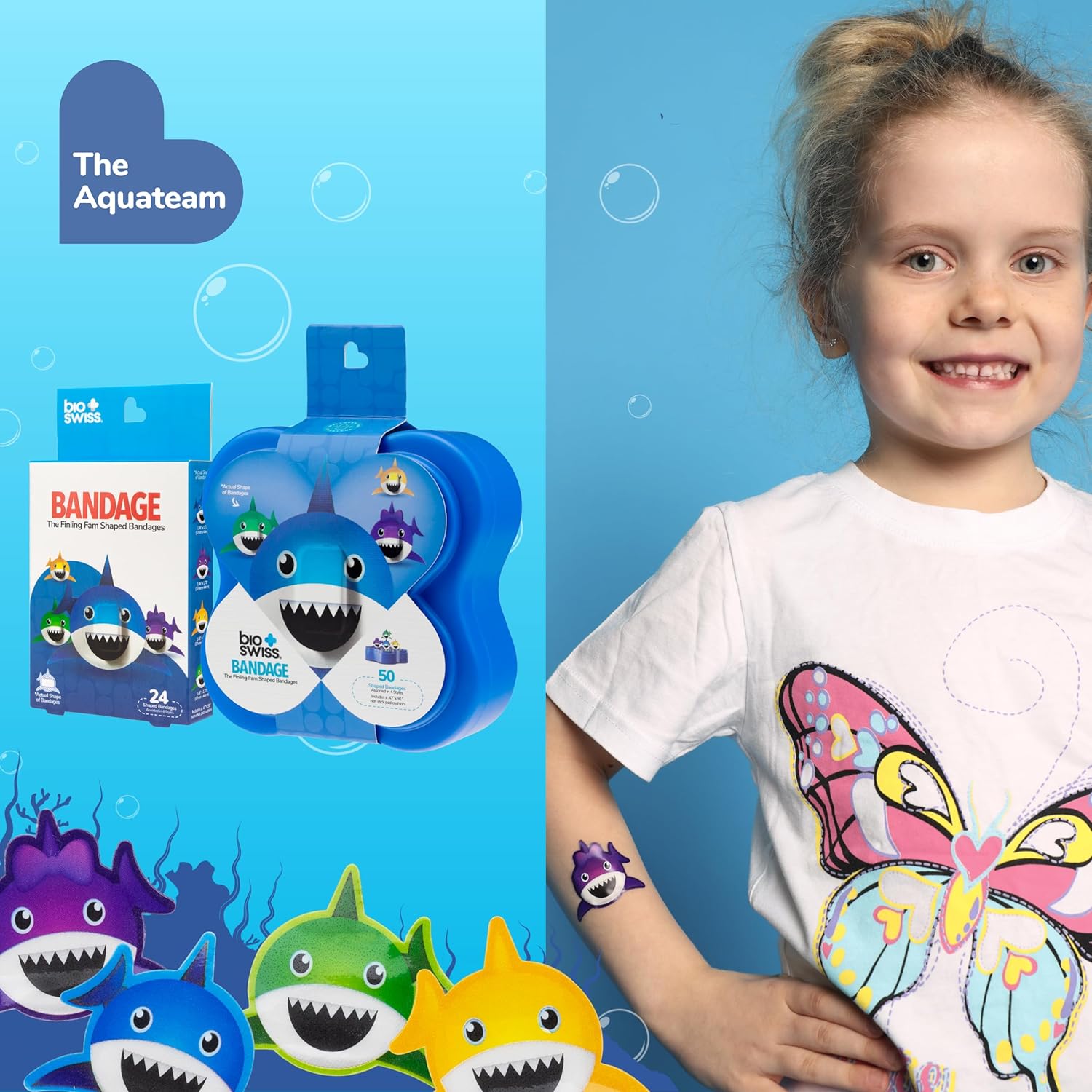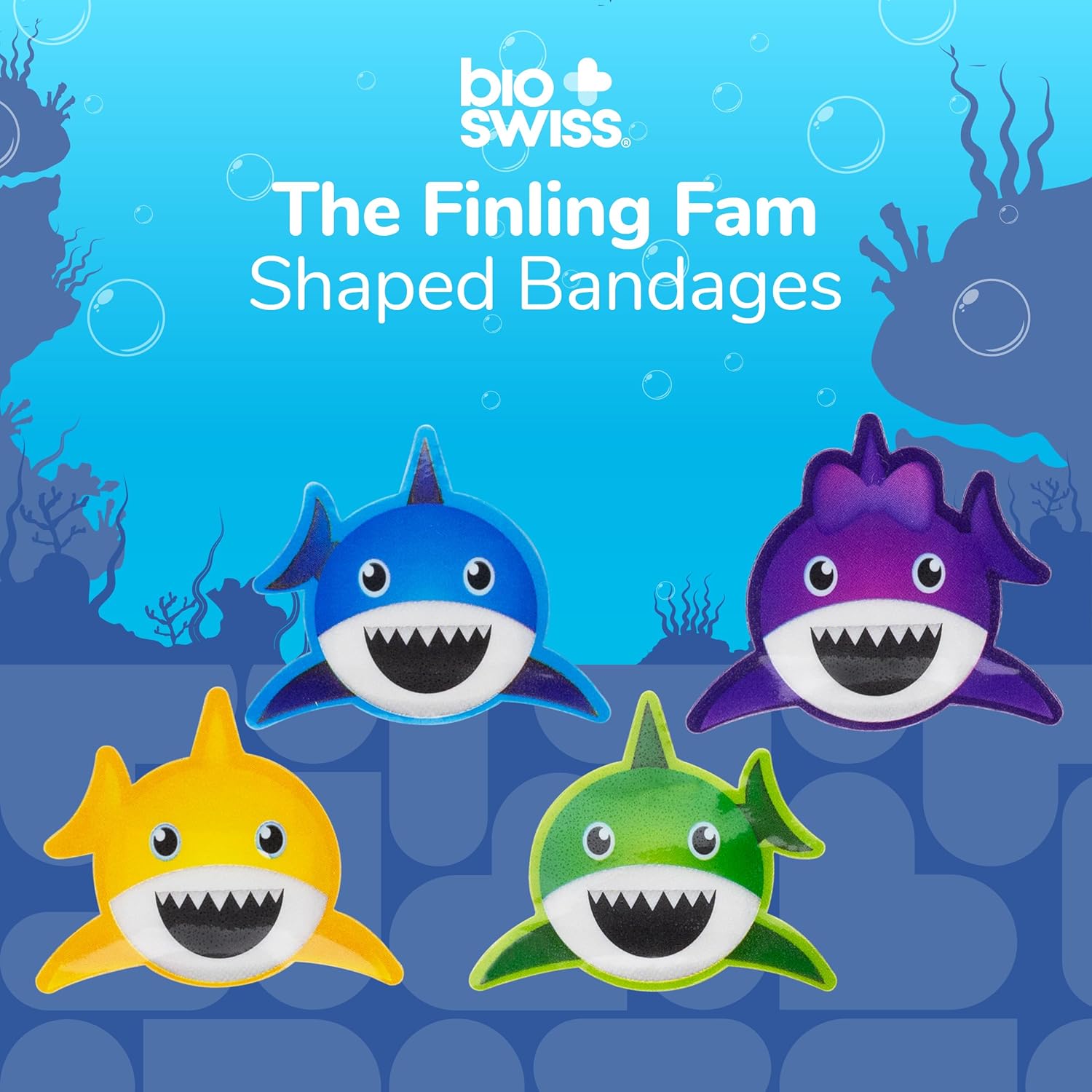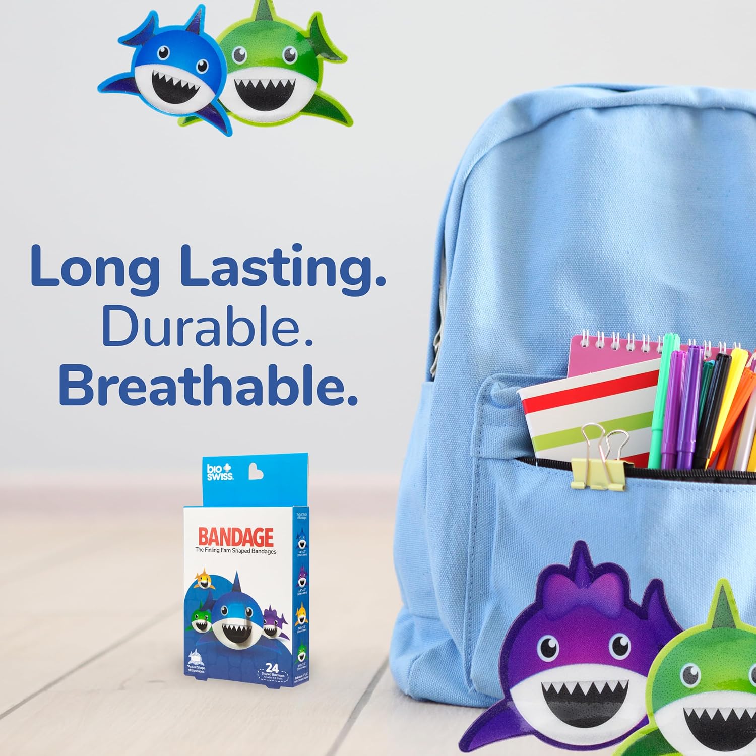 BioSwiss Kids Bandages, Finling Fam Shark Shaped Self Adhesive Bandage Set, Latex Free, Sterile Wound Care, 24 Count