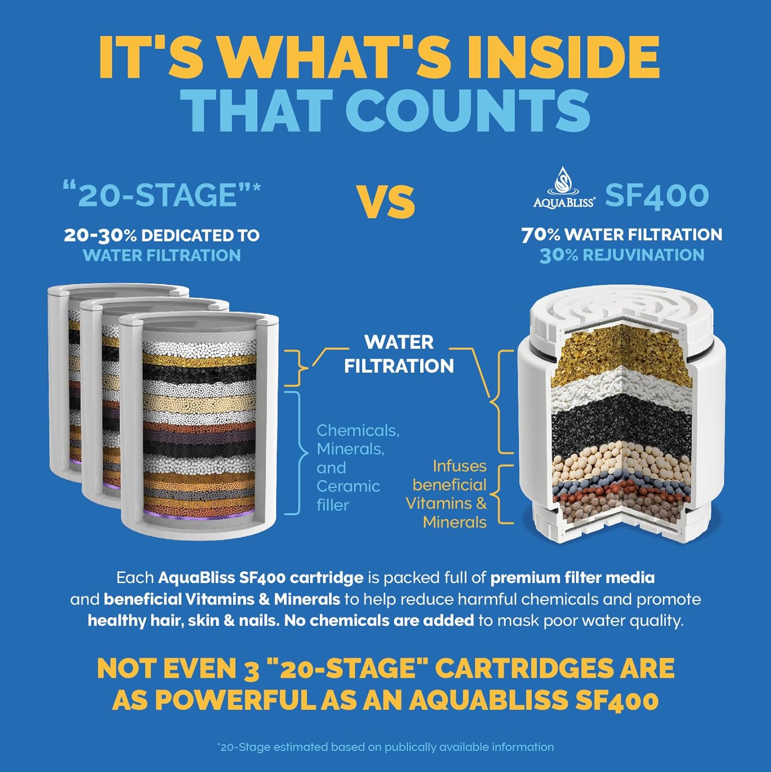 - 40% More Power - The Same Proven Stages - This is the vitamin C shower filter cartridge to get if you want 40% more of the maximum potency power that reduces chemicals, metals, toxins, impurities and sediment - without the fillers, fluff or âpaddingâ youâll find in those 15, 50 or 100 stage vitamin C filter shower head.