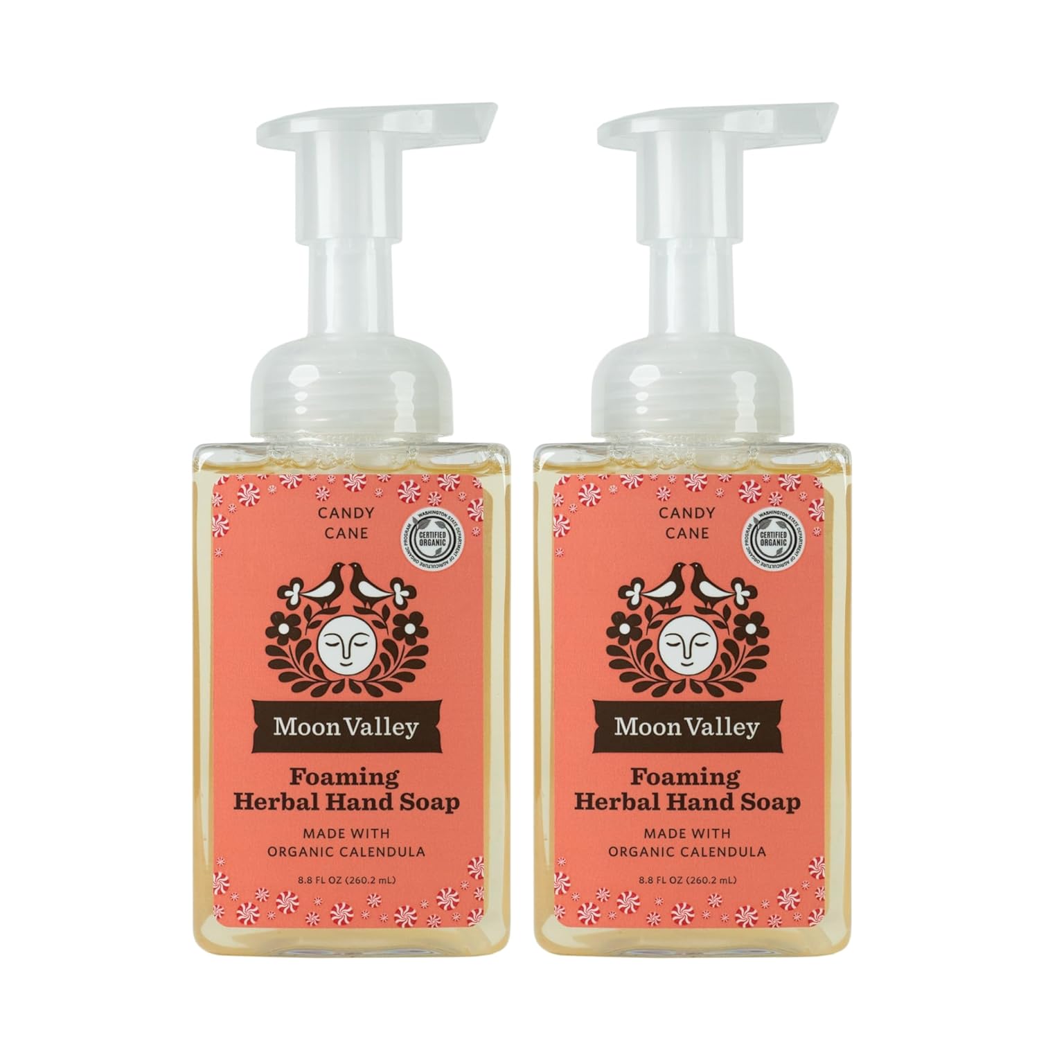 - TWO-PACK: This bundle of two 8.8oz Foaming Hand Soaps includes fresh and natural scents of Candy Canes. Moon Valley Organics Herbal Foaming Hand Soaps are certified organic, vegan and non-gmo. Each bottle is recyclable. Ingredients leave hands soft and moisturized.