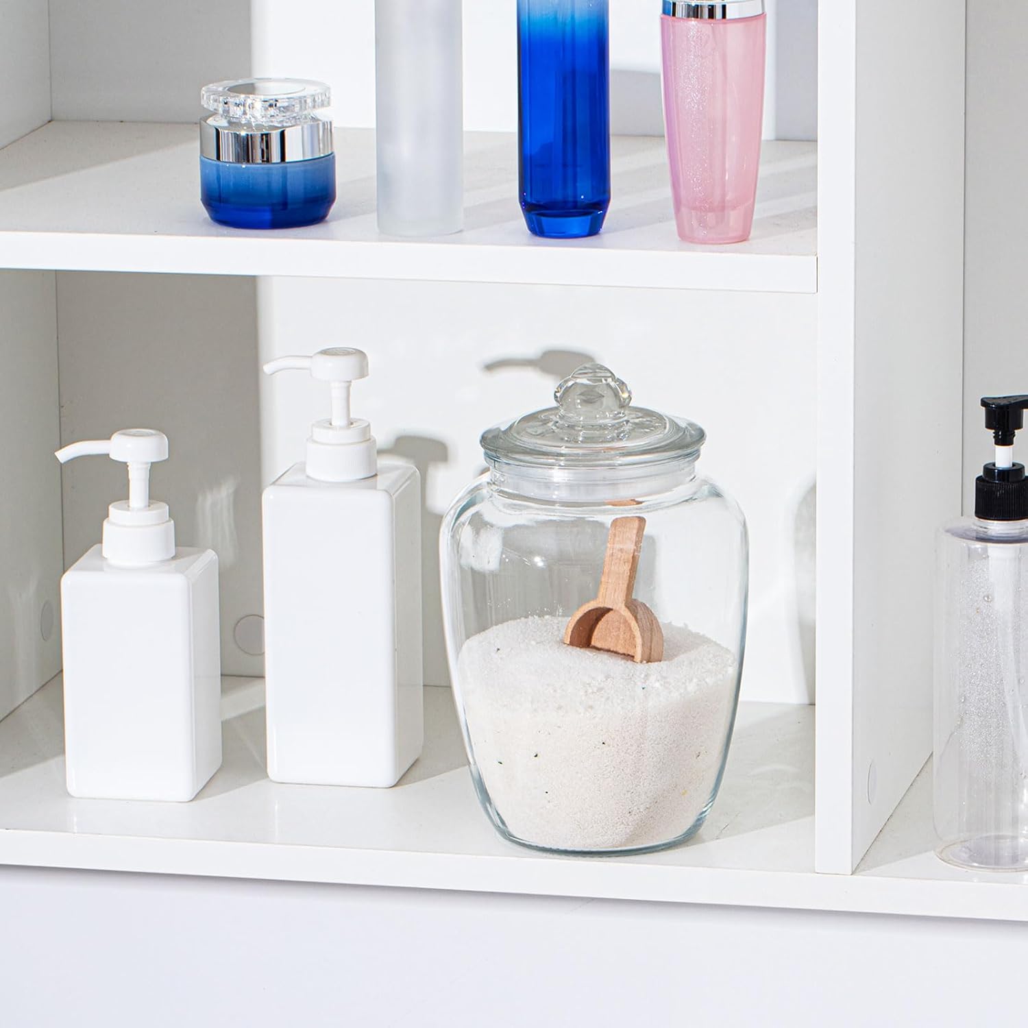 - Quality Reliable Longevity: our bath salt jars with scoop are made from quality materials; The glass container ensures longevity, while the wooden scoop adds a rustic elegance to your bathroom storage items