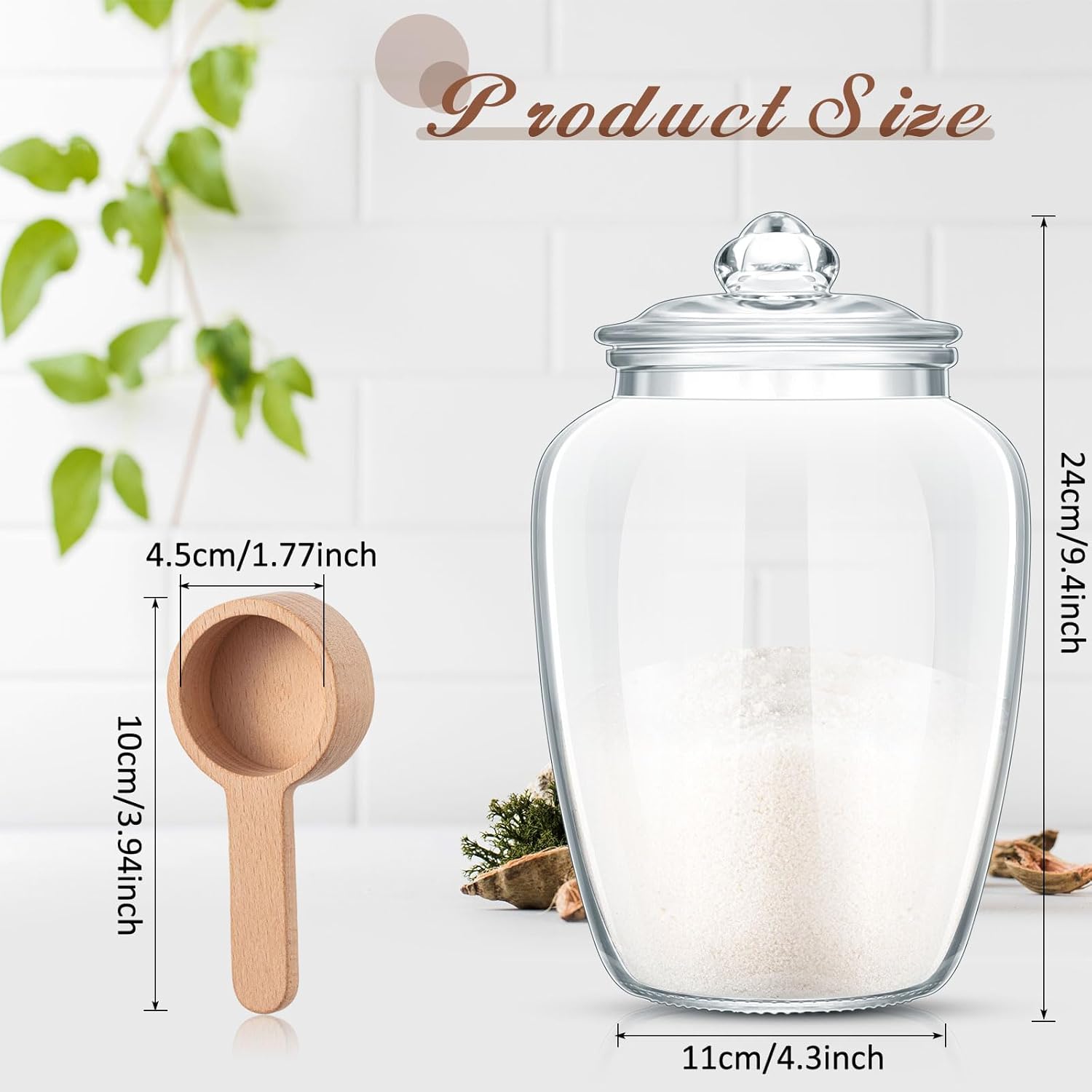 - Distinctive Craftsmanship: crafted with glass and equipped with a wooden scoop, the 2 sets of bath salts glass jars don't just satisfy your storage needs, they add a touch of classic and rustic to your bathroom or kitchen decoration; Their size of about 9.65 x 5.91 inches with a capacity of about 74 oz offers ample space to store bath salts or even laundry soap