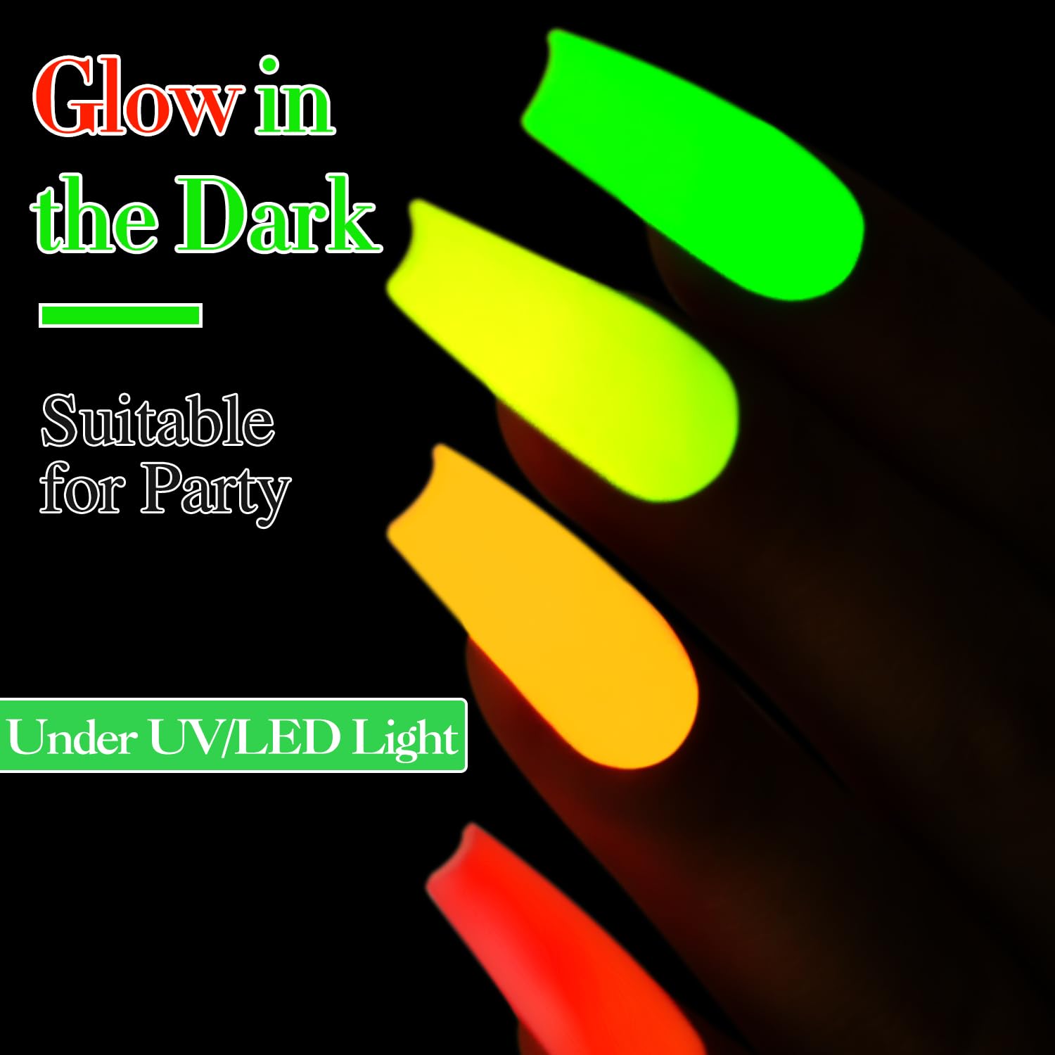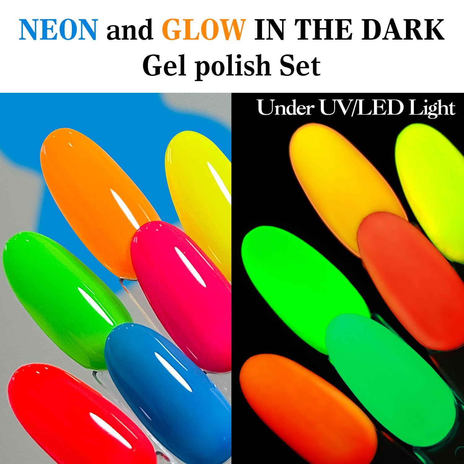 - Glow in the Darl Gel Nail Polish Set: Double Rhythm glow in the dark gel nail polish kit includes 6colors 7.5ml / 0.26 fl.oz gel nail polish. This neon gel nail polish set includes neon green ,neon pink,nean yellow,neon orange,neon purple,neon blue 6 colors. They can be combined with each other arbitrarily, so you can creat your own nail art sthle.