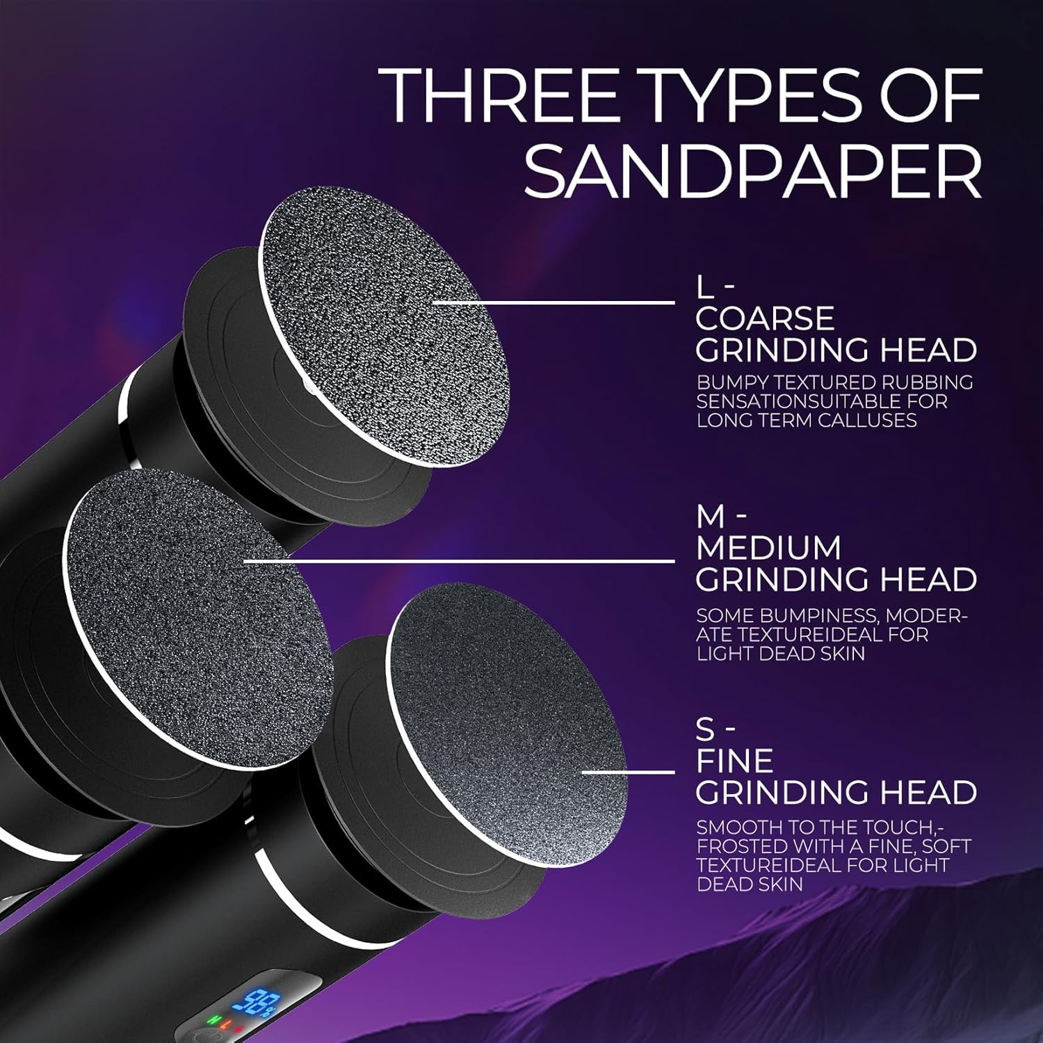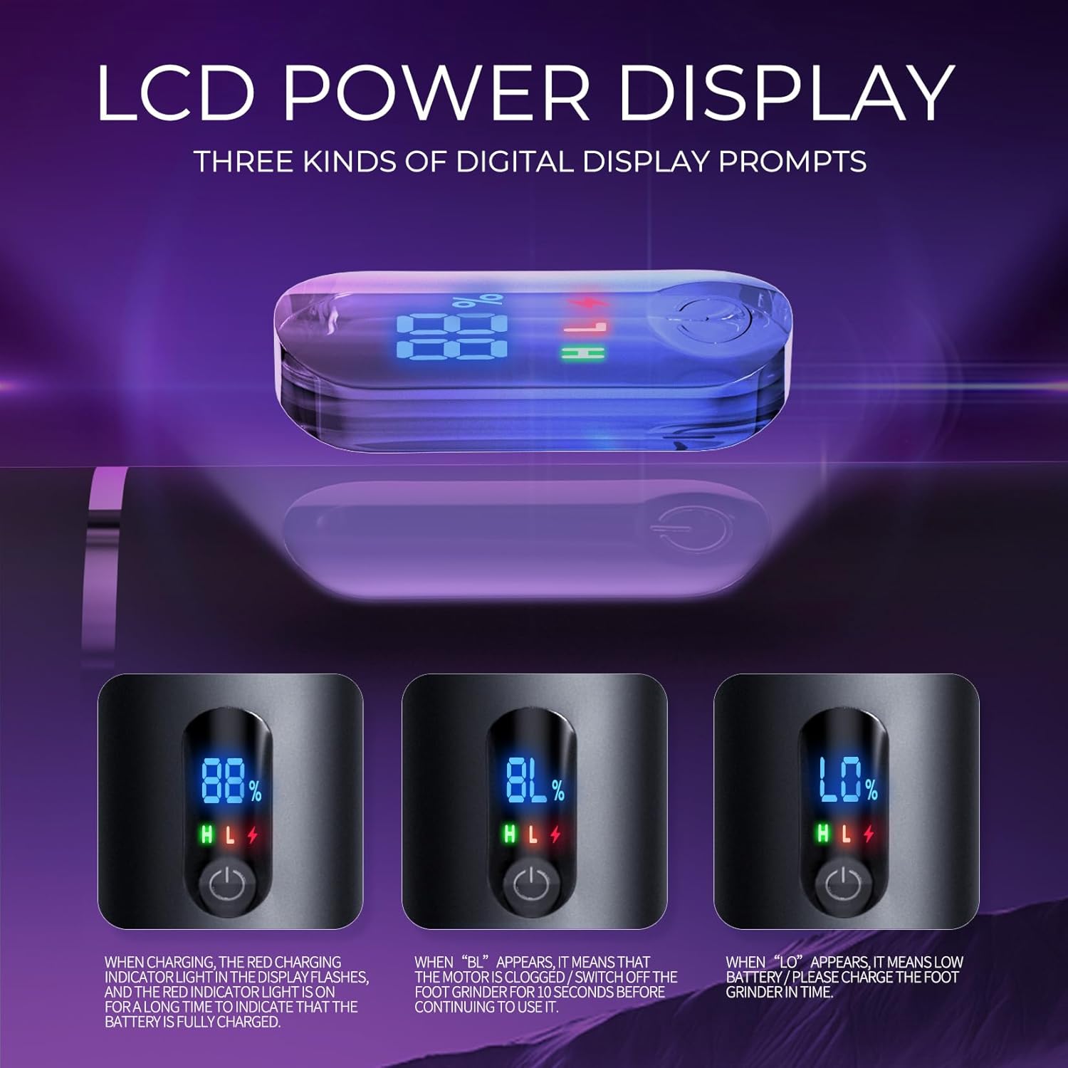 - 【Professional-Grade Callus Removal】krofaue electric foot file features 30 replaceable sandpaper (10 fine/10 medium/10 coarse) for complete dead skin care.Disposable sandpaper for cleanliness and hygiene, and can be replaced at any time according to your needs. The 2-speed motor (600/1000 RPM) with digital display adapts to all foot types - gentle polishing for sensitive areas or deep cleaning for stubborn calluses.