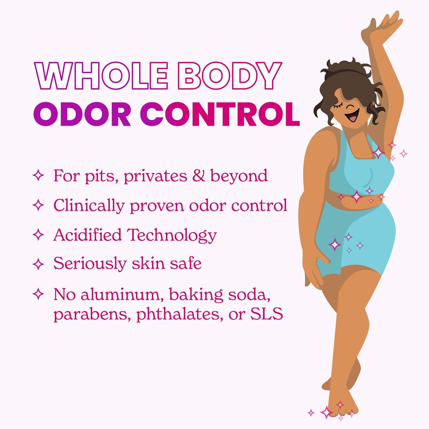 - SMELL BETTER EVERYWHERE - Odor control for pits, privates and beyondâthink feet, underboob, belly buttons, tummy folds, butt cracks, thigh creases or anywhere else you have odor but wish you didnât.