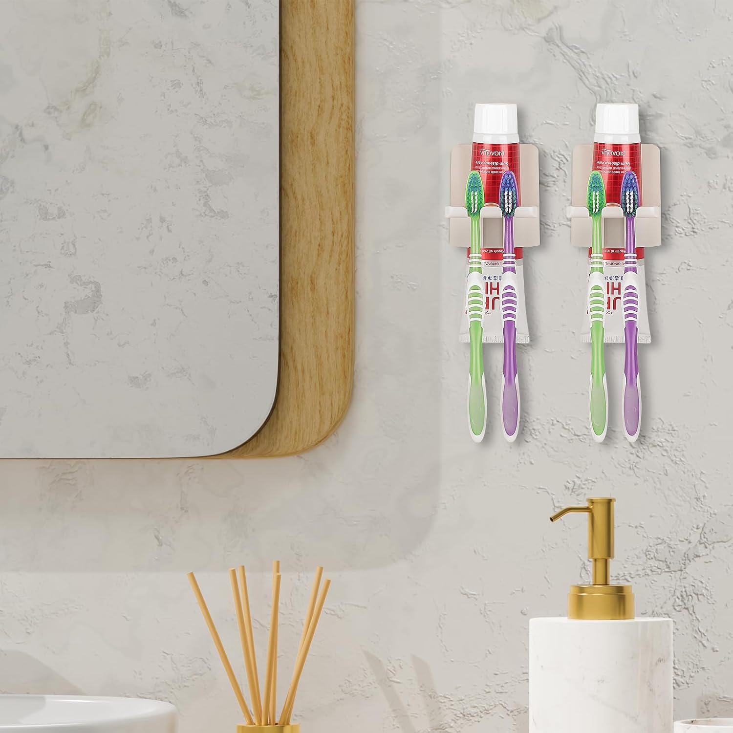 2 PCS Self-Adhesive Toothbrush Holders Wall Mounted, Water Proof Toothbrush Hook, 3 in 1 with Toothbrush Hanger Toothpaste Holder and Gargle Cup Holder for Bathroom Shower (Beige)
