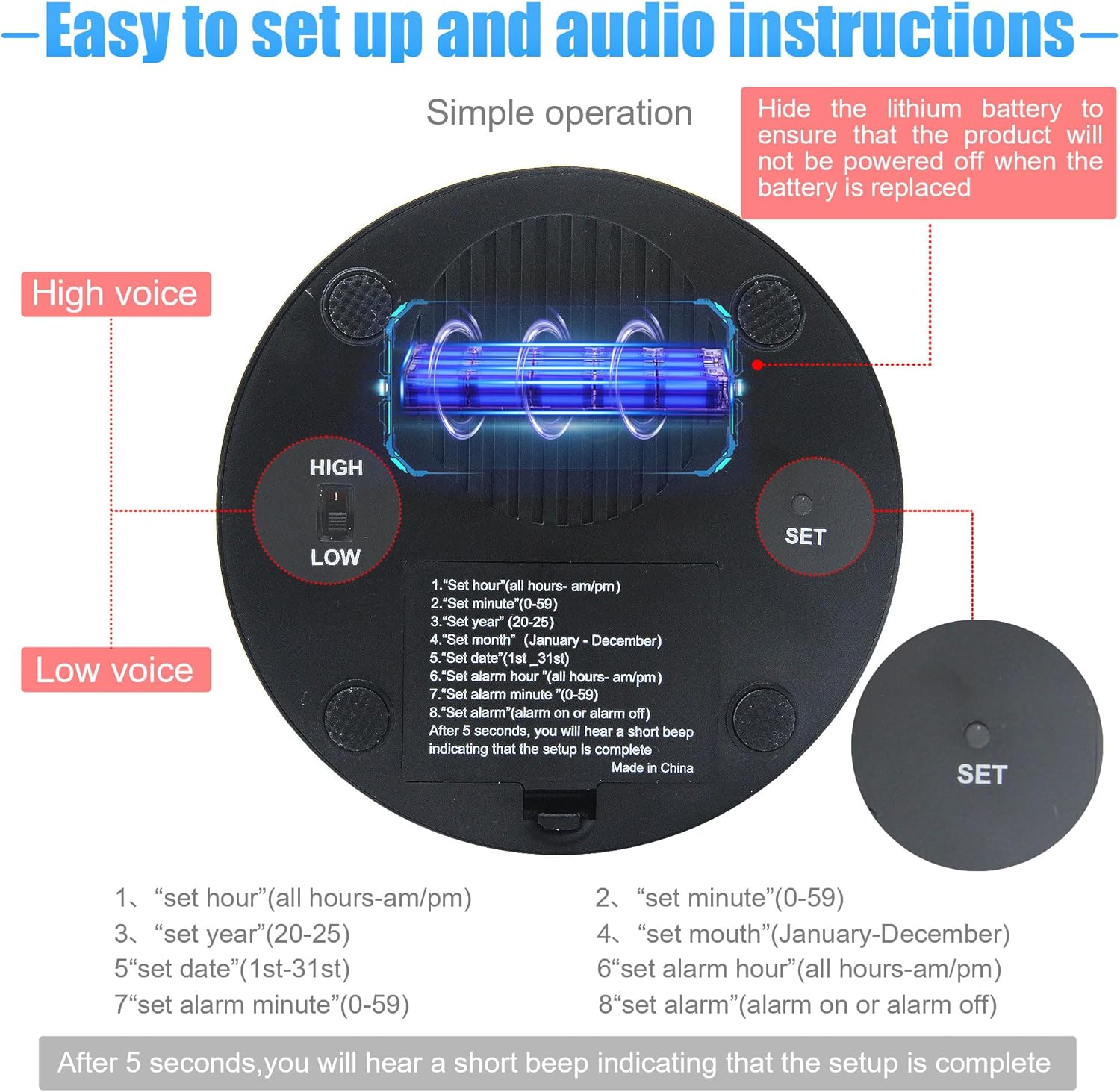 - â Idea Gift: While this alarm clock is a good choice for anyone, it is ideal for those who are blind or who have low vision, such as the elderly. This talking clock is easy to set and a breeze to operate.Just press the big button and this audible clock will tell you the time, press it again and it will tell you the date and day of the week. When the alarm goes off, press the big button to stop the alarm. The setting button is at the bottom to prevent accidental setting, YOU CAN DIRECTLY PRESS THE +/- KEY ON THE BOTTOM TO ADJUST THE VOLUME.