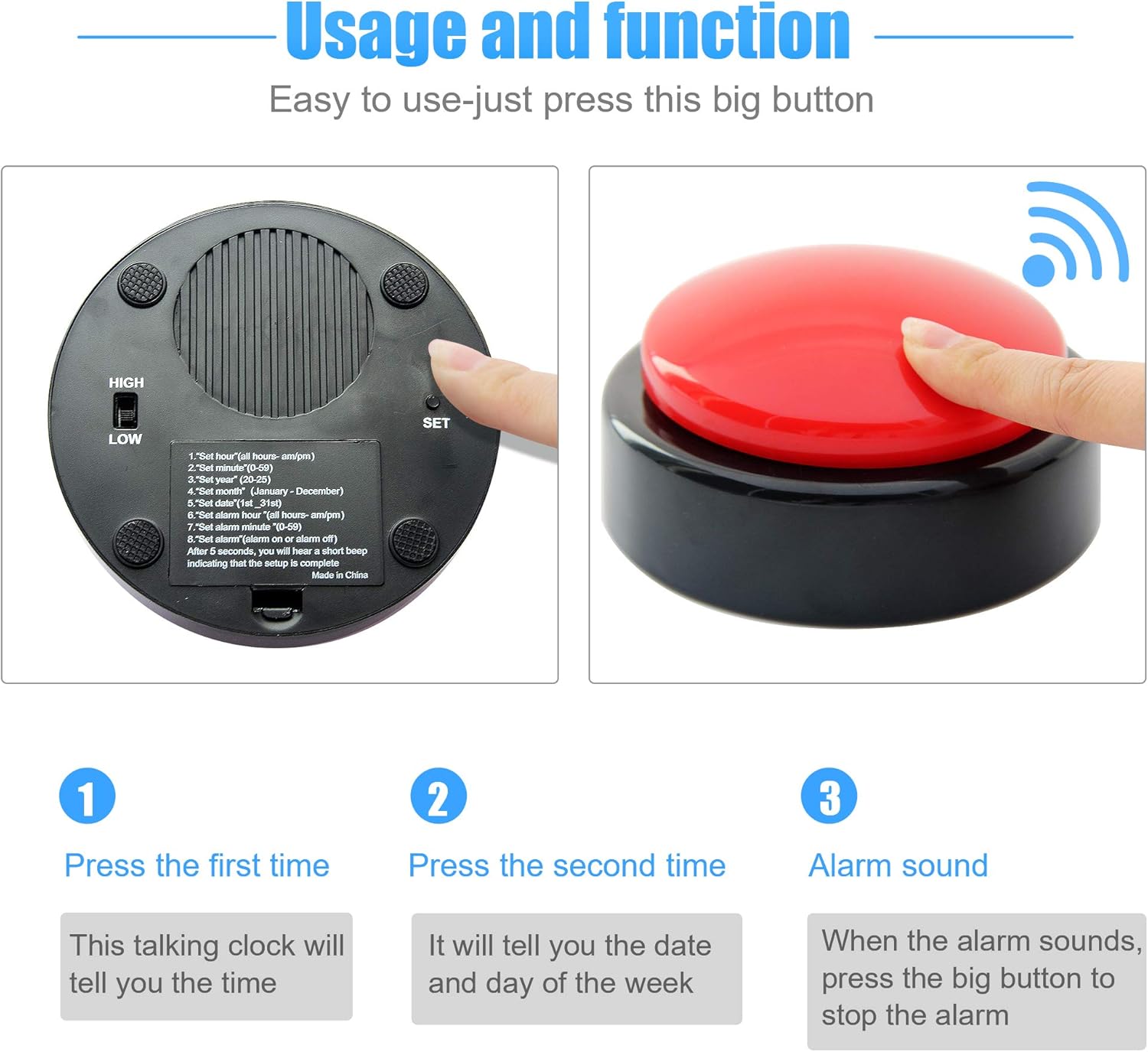 - â How to Use : Just push the large button and this speaking clock will tell you the time, Push it a second time and it will tell you the date and day of the week. When the alarm sounds, push the large button to stop the sounding of the alarm.Two settings for voice in the bottom - High and Low.
