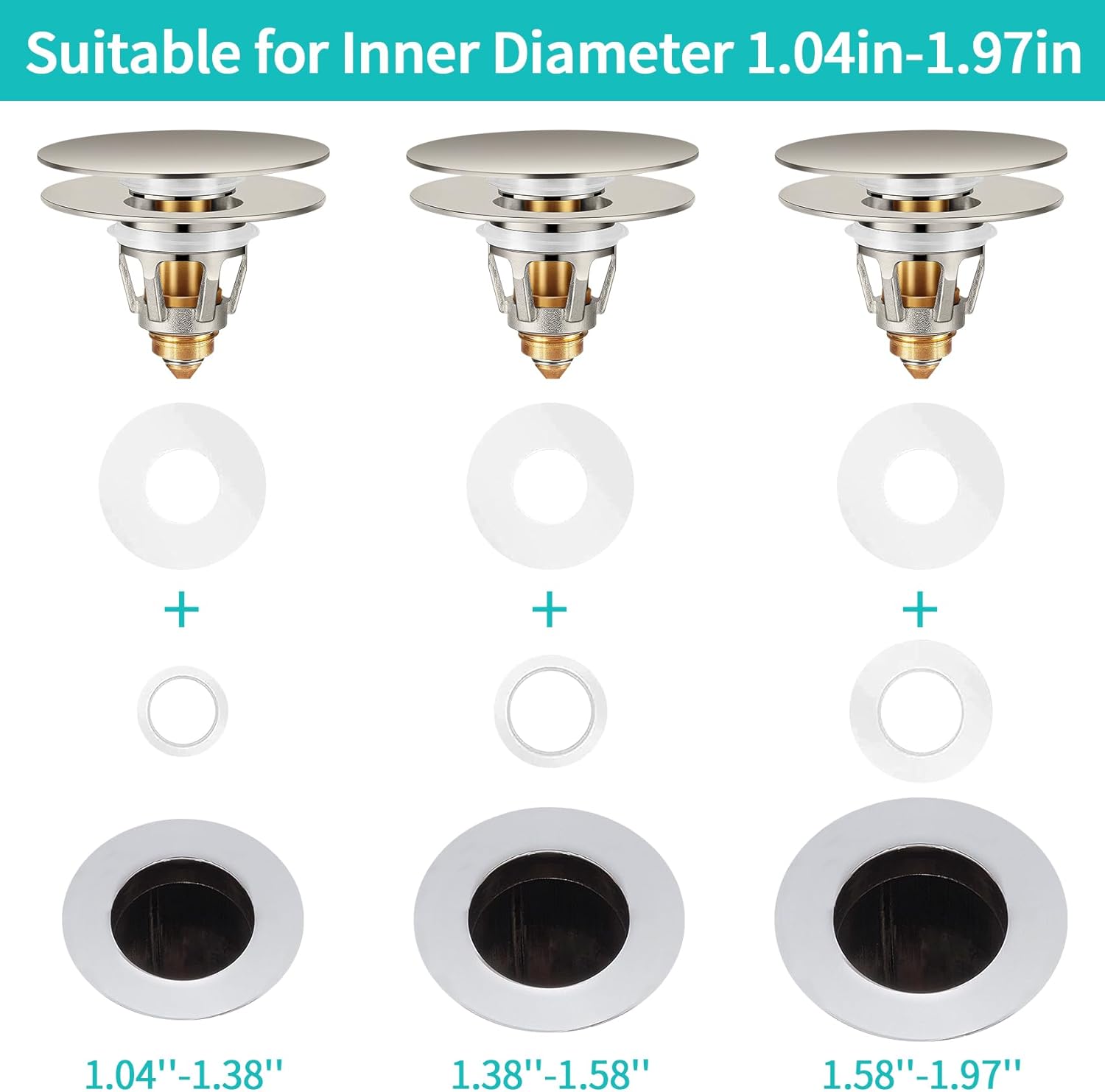 - [ Universal Size ] The bathroom sink stopper plug is mainly made of high quality thickened brass material, can be used for the different types of basin drain. The inner diameter of sink stopper strainer is 1.04ââ. Suitable for drain holes with an inner diameter of 1.04-1.97 inch.