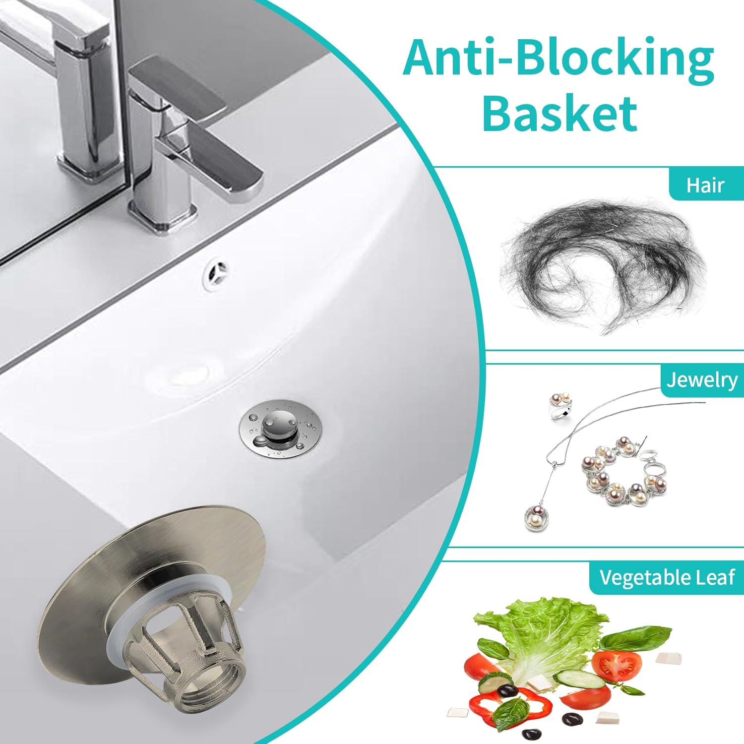 - [ Build-in Strainer ] The sink plug with an anti-blocking basket strainer inside which can collect hairs and prevent the drain from clogging up, achieving effective filtering, unlike regular push button drain. Suitable for bathtub, bathroom and kitchen sink, and so on.