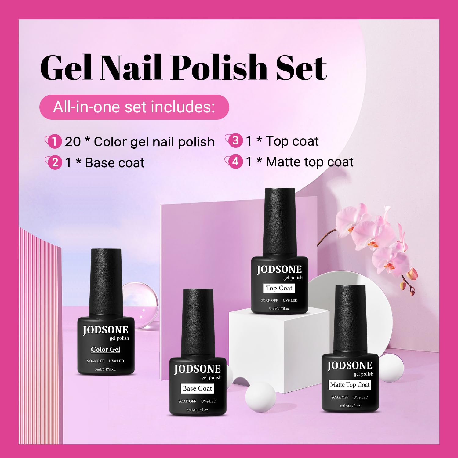 JODSONE 23 PCS Glitter Gel Polish with Soak off Base Coat Matte and Glossy Top Coat Glitter Red Pink Color High Shine and Fashion Gel Nail Polish Kit