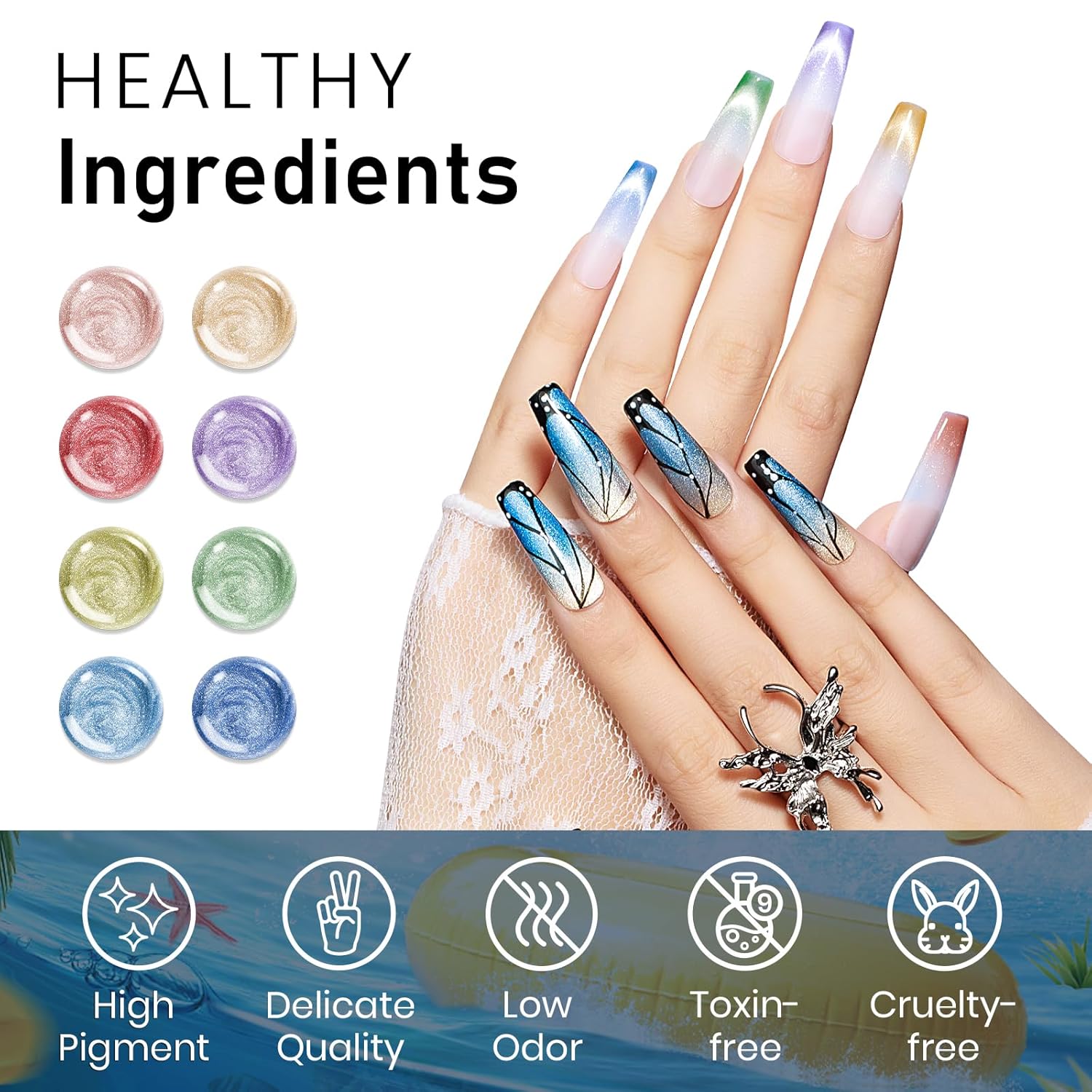 - Healthy and Long Lasting: Made from natural resin, healthy ingredients, low odor, non-toxic, cruelty-free and environmental. No harsh ingredients or adhesives that lead to damaged nails. The shimmery glitter cat eye gel nail polish can last over 28 days with correct application.