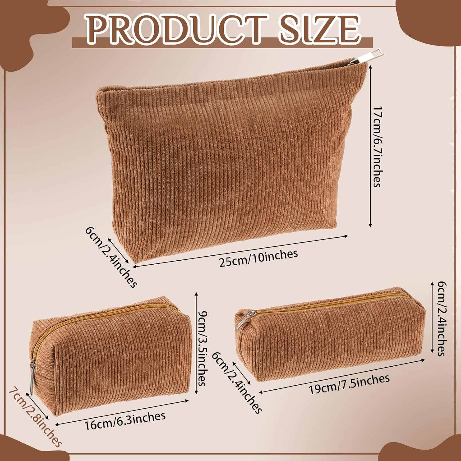 3 Pcs Makeup Bag Set for Women Corduroy Cosmetic Pouch Aesthetic Smile Travel Toiletry Bag Cute Purse Pouch Pencil Case Makeup Brushes Storage Organizer for Christmas(Brown,Solid Style)