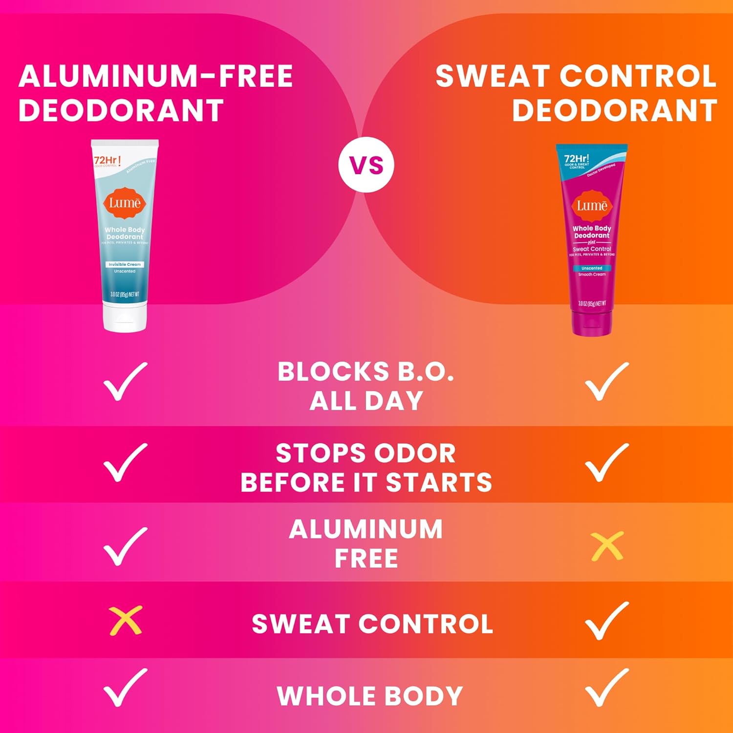 Lume Whole Body Deodorant Plus Sweat Control - Smooth Cream Tube - 72 Hour Odor And Sweat Control - Baking Soda Free, Skin Loving - 3.0 ounce (Pack of 2) (Unscented)