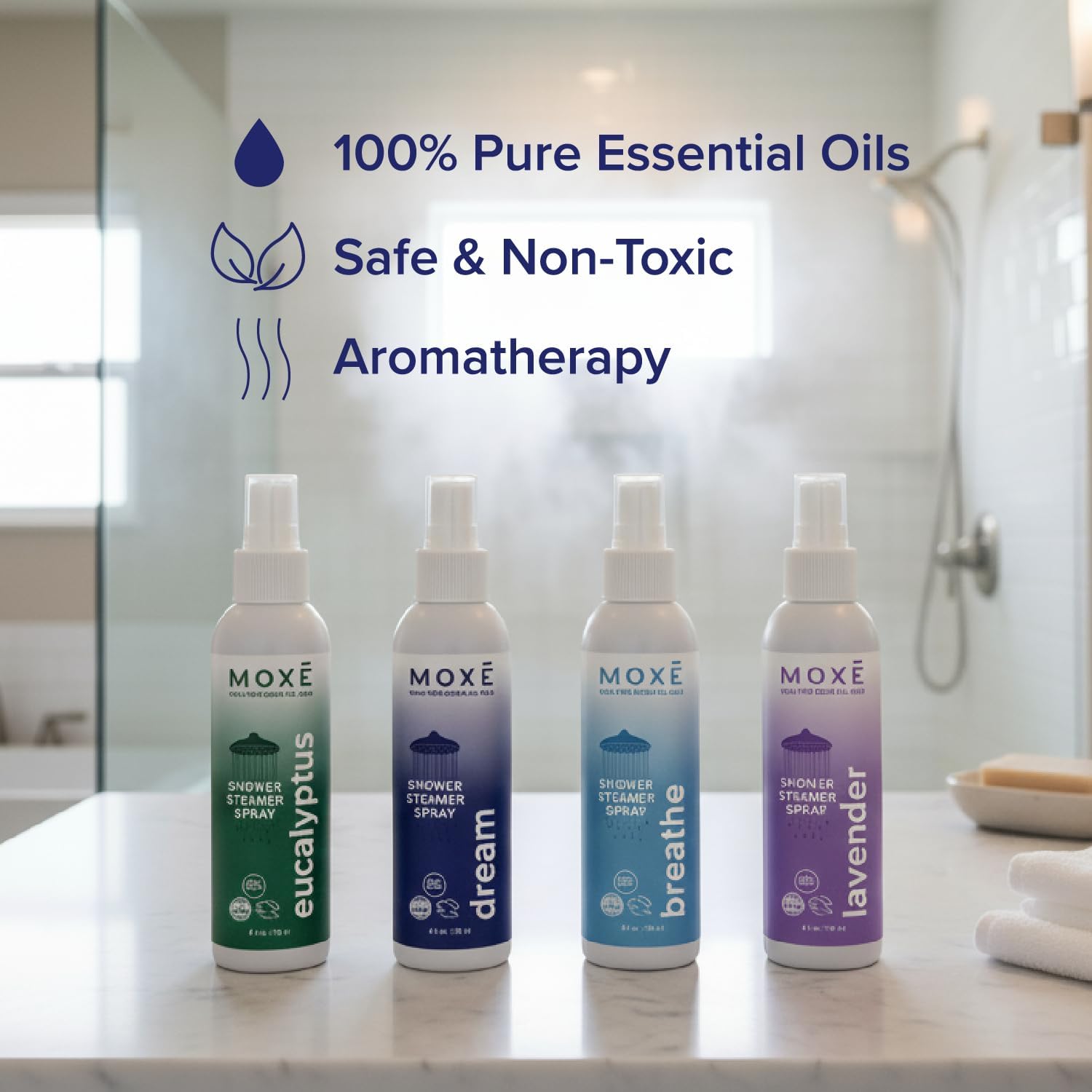 MOXE Aromatherapy Shower Mist Variety Pack, Eucalyptus, Lavender, Breathe and Dream, Spa Steam Spray, Natural 100% Essential Oils, Made in USA, Aromatherapy, Sinus Congestion Relief, 4 Pack (8oz)