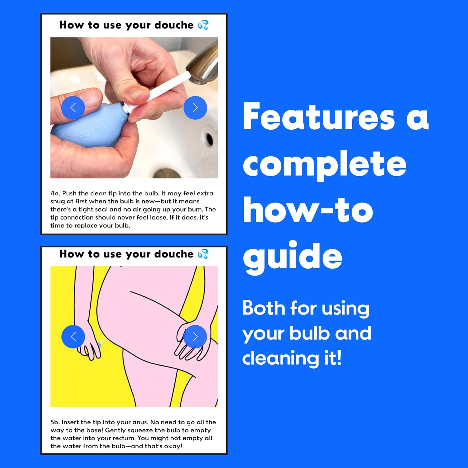 - Easy to clean // The flexible, medical-grade material makes this douche incredibly easy to clean, and its compact size means it dries quickly. Plus, the white tip allows you to easily spot-check when douching so you don’t have to run back to the bathroom for round 2. Just wash the tip and bulb separately with soap and warm water, dry them, and keep them in a dry, cool place when you’re not using them.