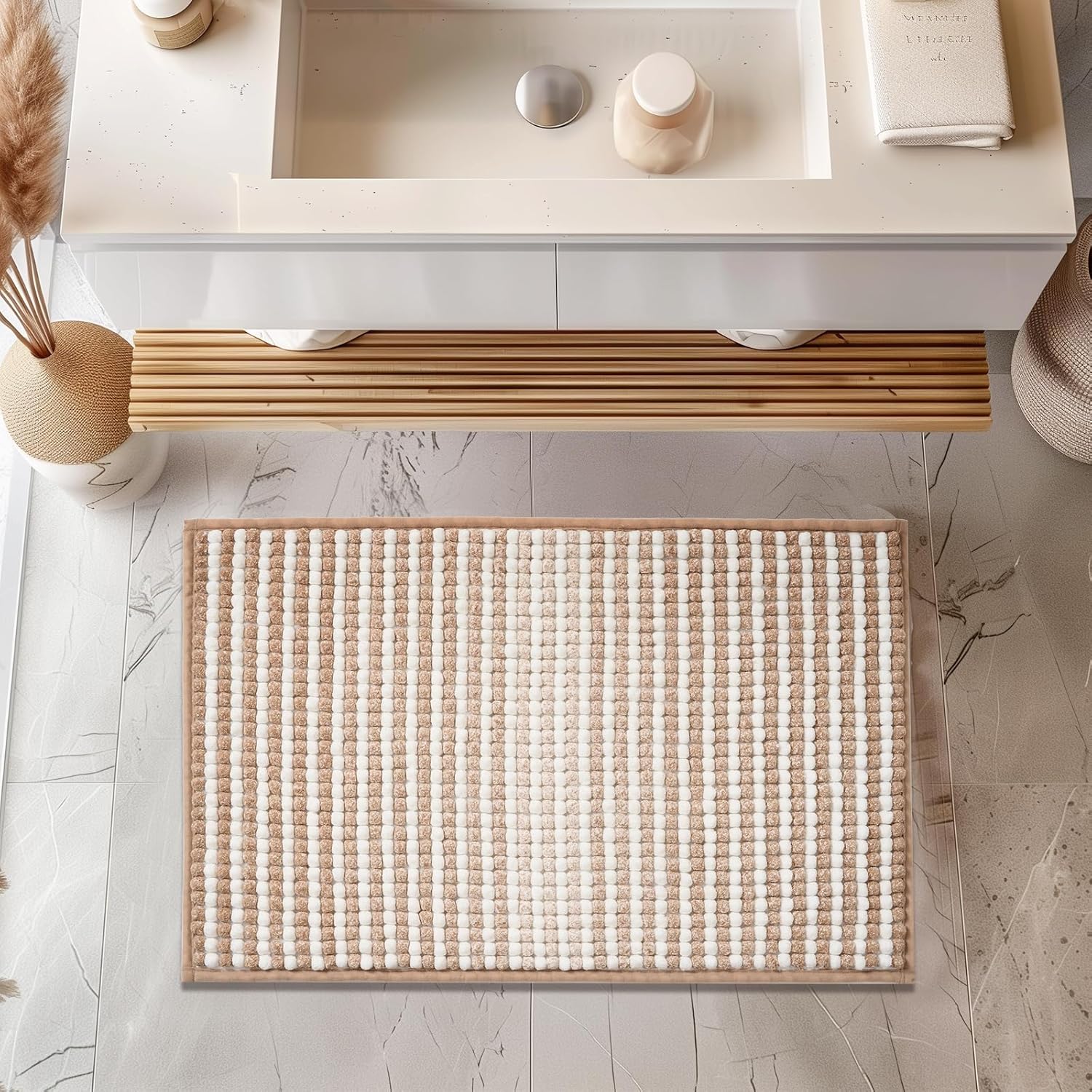 FRESHMINT Chunky Ombre Chenille Bathroom Rug 20"x32", Water Absorbent Soft Bath Rugs for Bathroom Floor, Thick Non Slip Bath Mat Washable Quick Dry Shower Mats, Beige and White