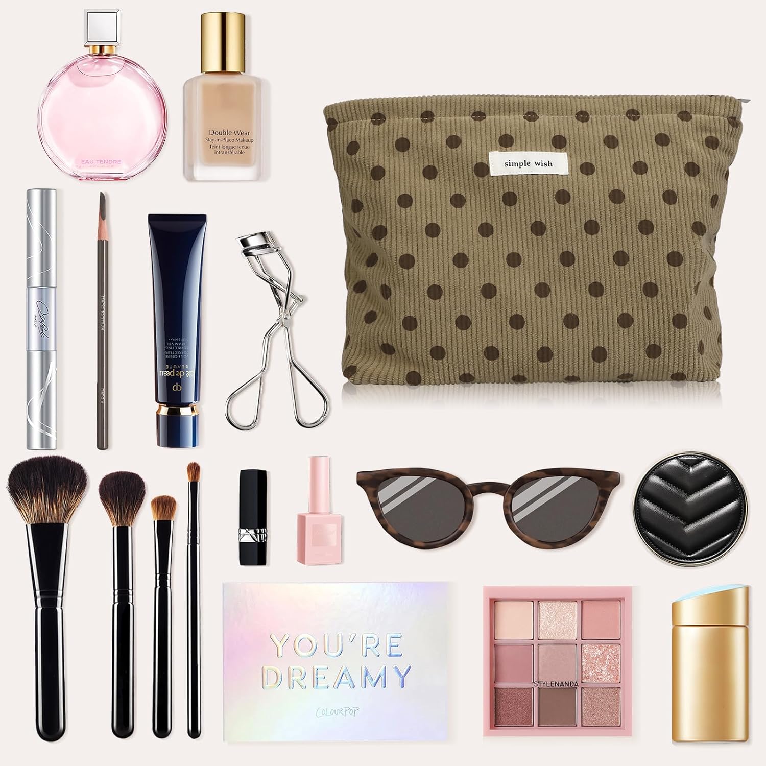 Wudygirl Travel Makeup Bag Cute Cosmetic Bag Large Capacity Makeup Pouch Make Up Organizer for Women and Girls Portable Toiletry Bag Corduroy Zipper Pouch (Brown Polka Dots)