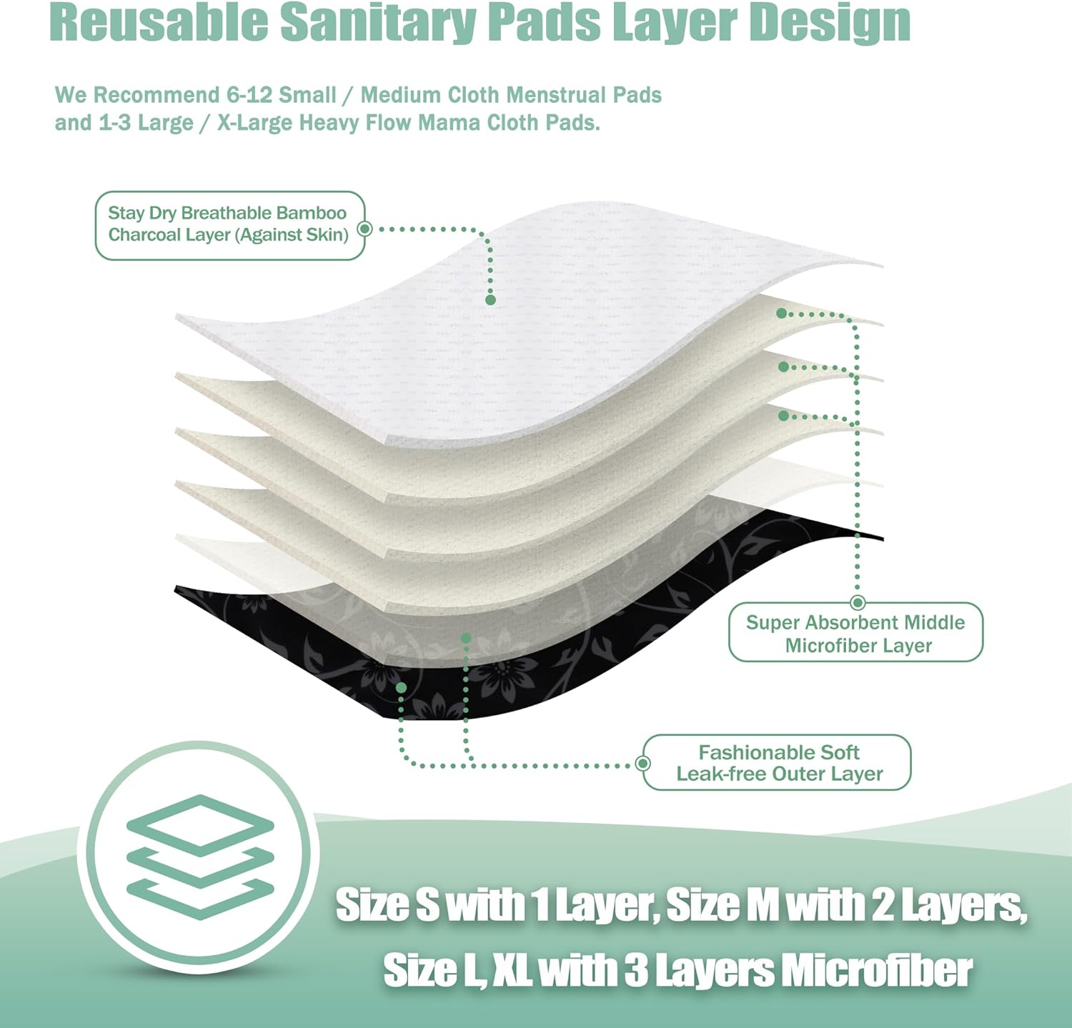 - CHARCOAL INNER LAYERS of these cloth menstrual pads is soft with maximum and have a stay dry surface.The dark color is forgiving of stains and Not only great at soaking up liquid, smells are neutralized. Middle layers microfiber make this reusable sanitary napkin super absorbent