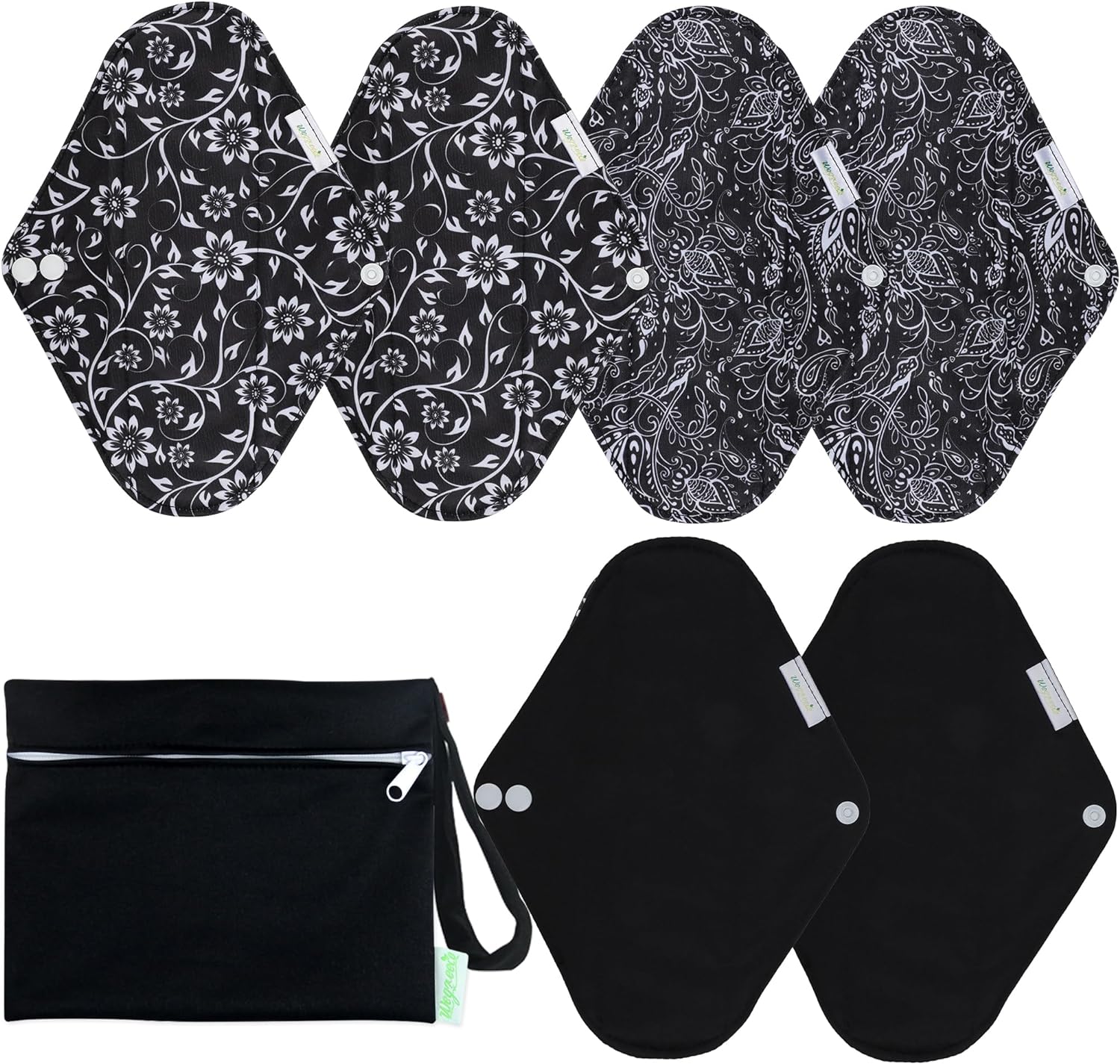 Wegreeco Reusable Menstrual Pads - Soft Cloth Sanitary Pads & Panty Liners - 6 Pack with 1 Cloth Mini Wet Bag (Large, Black Flowers)