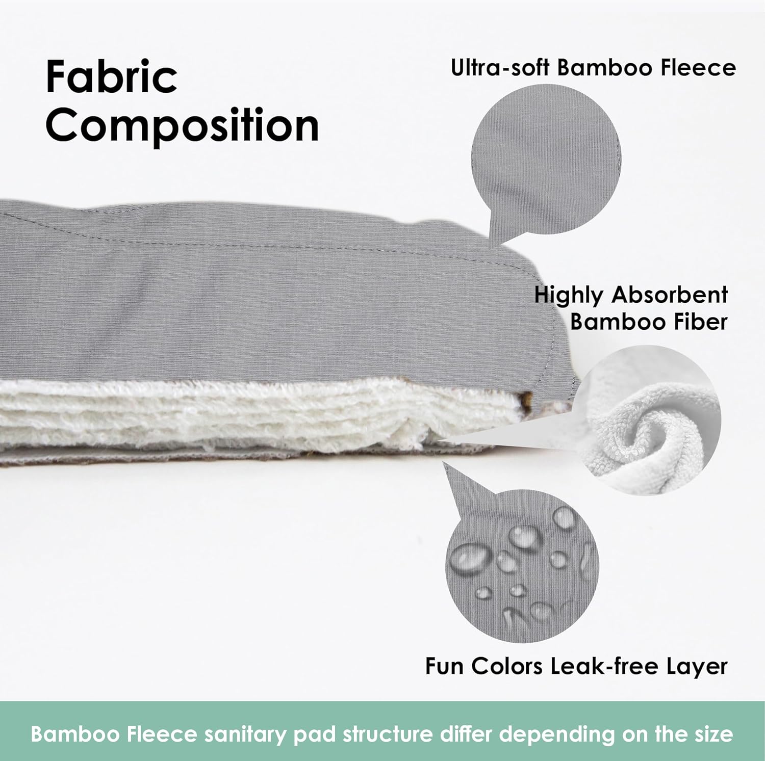 - Breathable Layer: Cloth panty liners structure differ depending on the size. Menstrual cloth pads Inner layer is ultra-soft fleece which lays against your skin, moistures wicking, and neutralizes odor. Lining layer is super-absorbent, and different sizes the layers are different. Outshell layer is leak-free TPU with backside silicon dot. The soft and gentle reusable sanitary pads offer great coverage and absorbency to keep you from leaks and spills