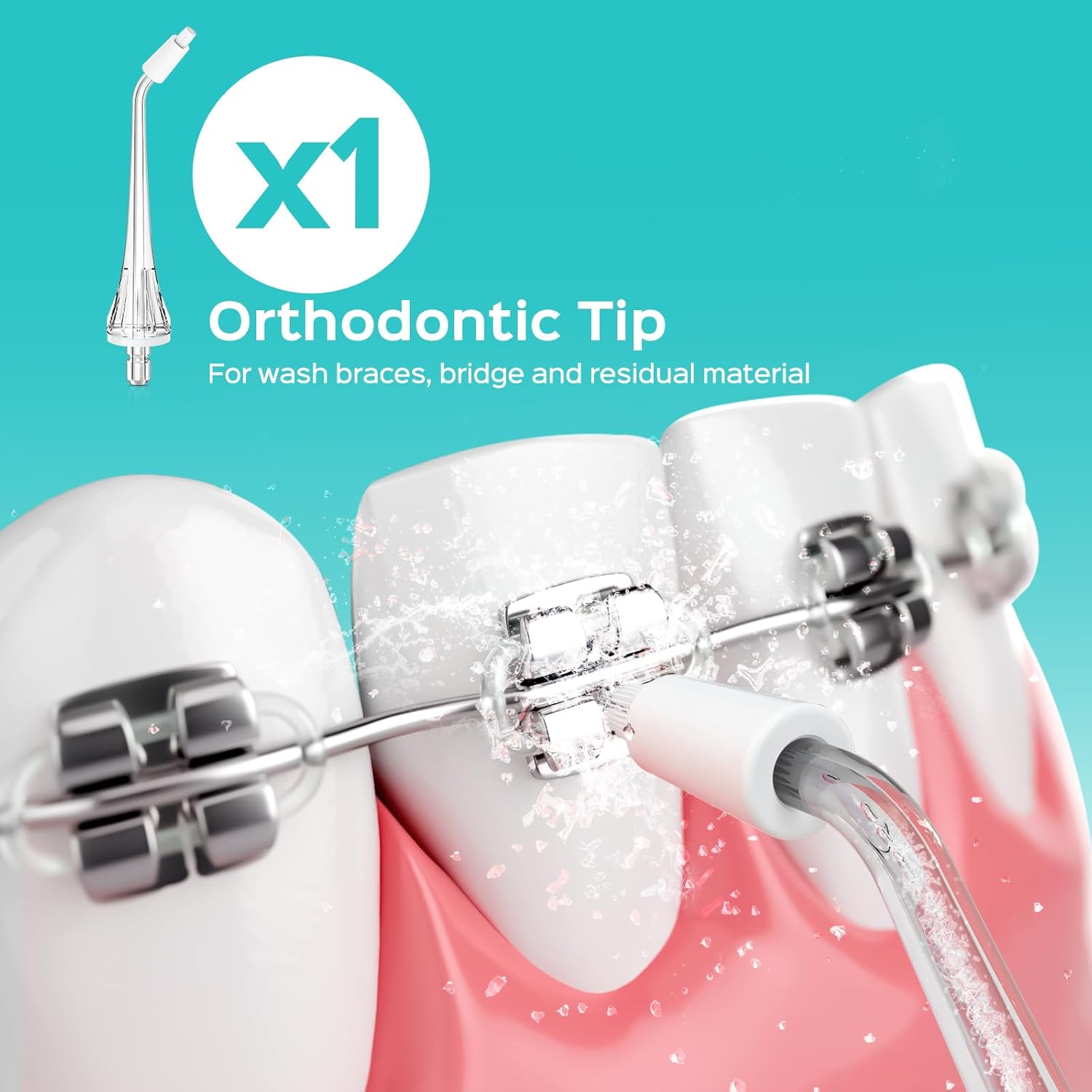 - Multi-Pack for the Whole Family: Choose appropriate tips based on different oral conditions. This set includes multiple tips to cater to everyone's needs. It is recommended to replace the tips every three months. (Standard jet tip for daily teeth cleaning, periodontal tip for gentle gum care, orthodontic tip for cleaning braces, bridges, and residual material, tongue cleaner tip for effective coating and residual removal.)