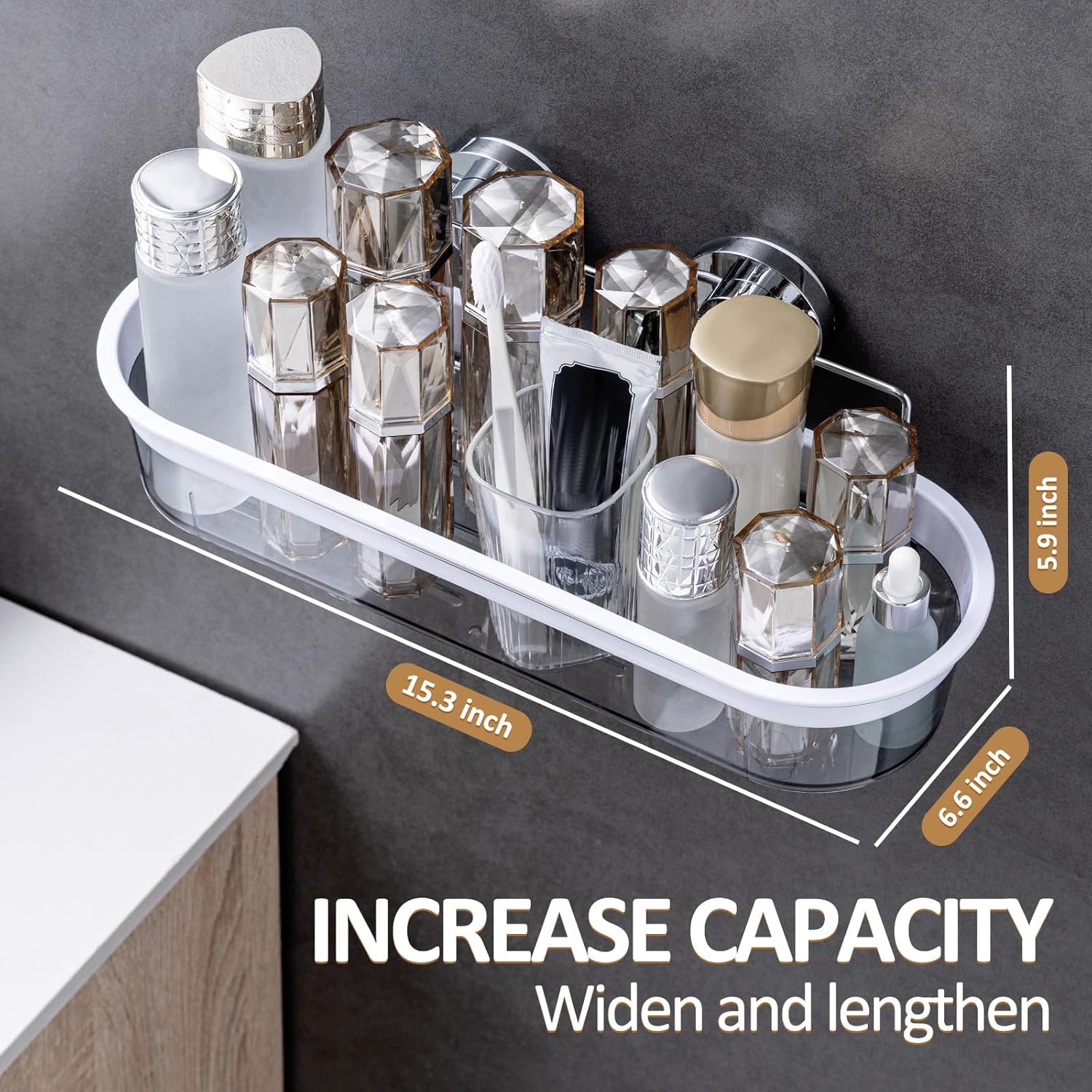 - SUPER SUCTION POWER : The suction pad of caddy for shower is made of anti-aging TPE material, which holds up to 18 lbs, works well even in wet or oil environment, like bathroom and kitchen. The dimension of the shower shelf for inside shower is 15.3* 6.6* 5.9 inch (L*W*H)