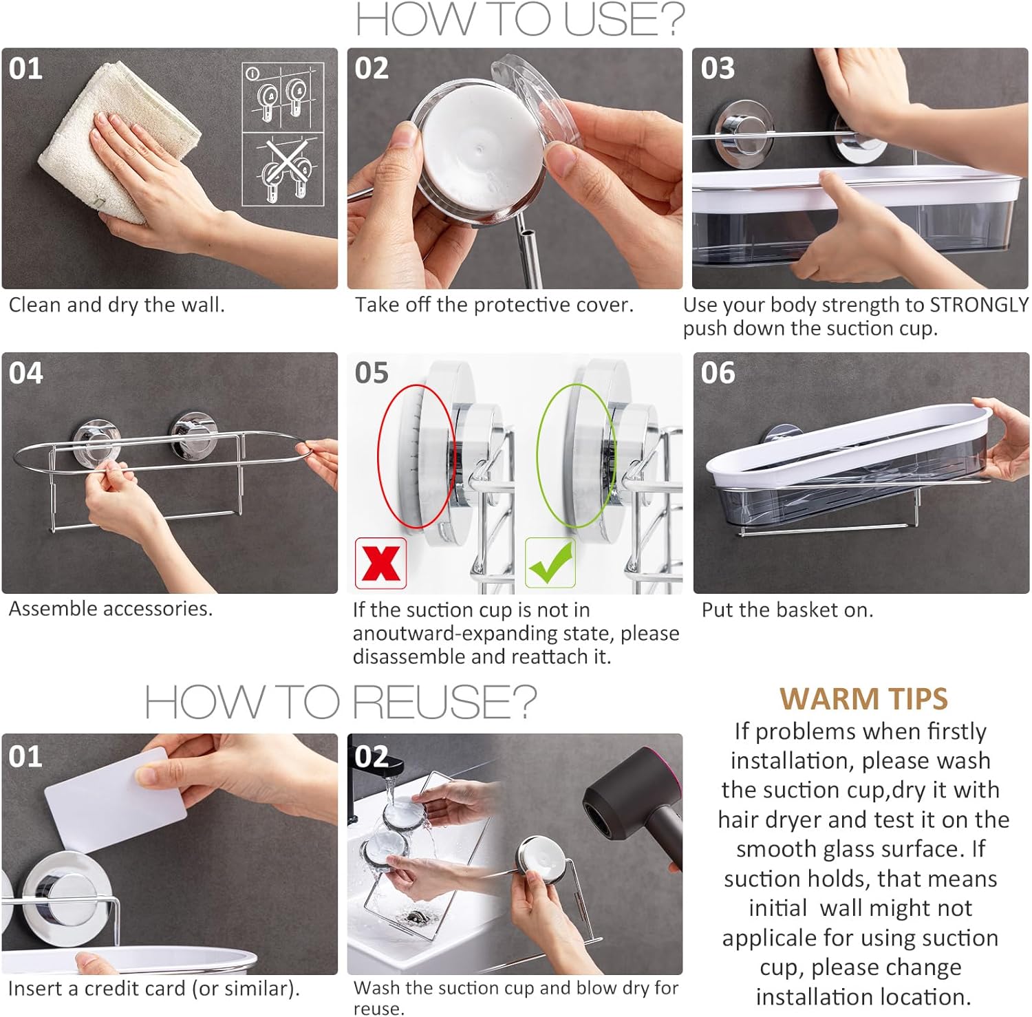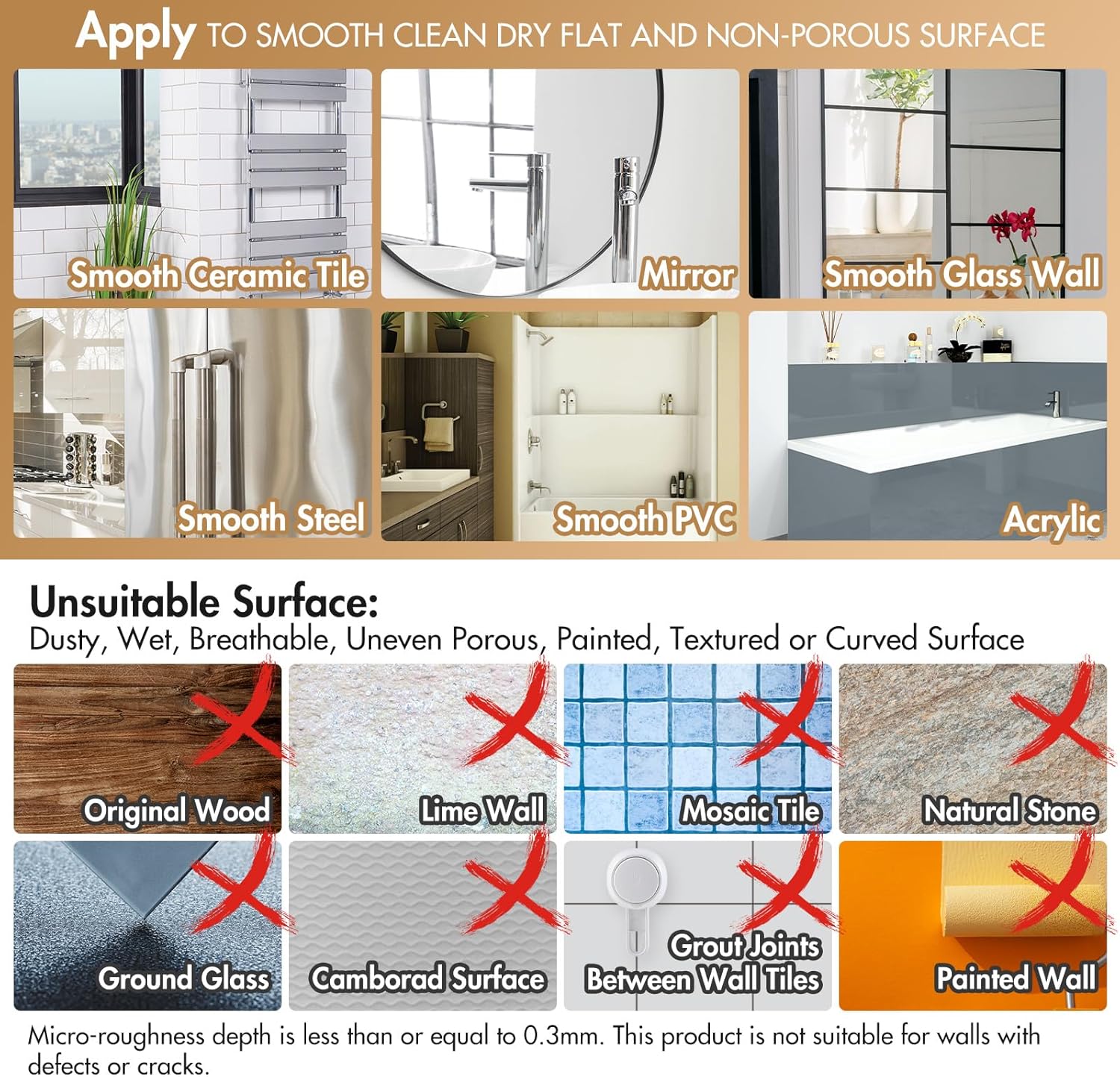 - WARM TIPS - This powerful shower organizer works best for non-porous, impervious, smooth surfaces such as glass, mirror, polished metal, stainless steel, plastic board, wall tile, grainy granite, etc. Please remind that don't stick to a grout line and on the porous surfaces such as: wood, unfinished marble, porcelain, wallpaper, natural stones (such as Travertines), painted wall, etc