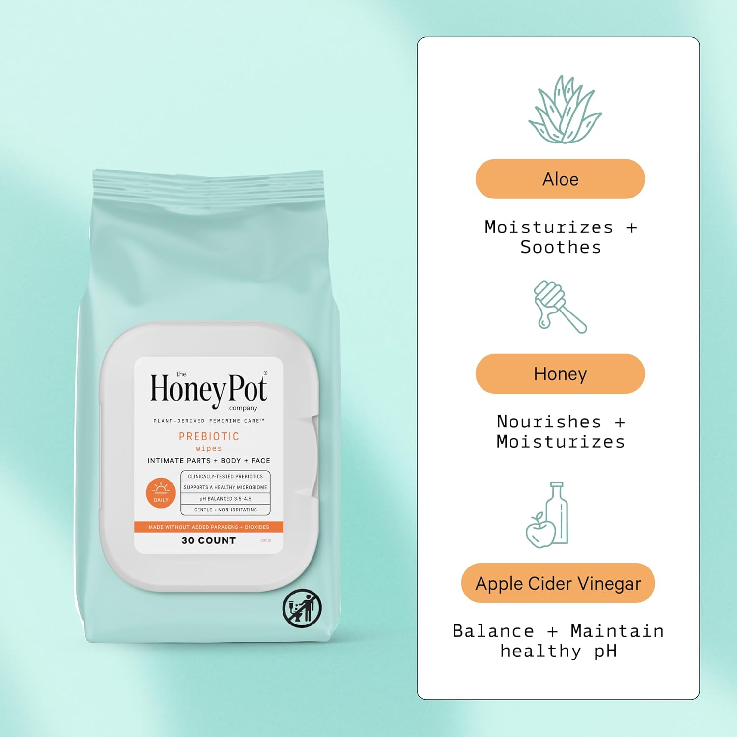 The Honey Pot Company - Prebiotic Feminine Wipes - Daily PH Balancing, Fragrance & Sulfate Free Wipes for Intimate Parts, Body, or Face - Hygiene Products - 30 ct.